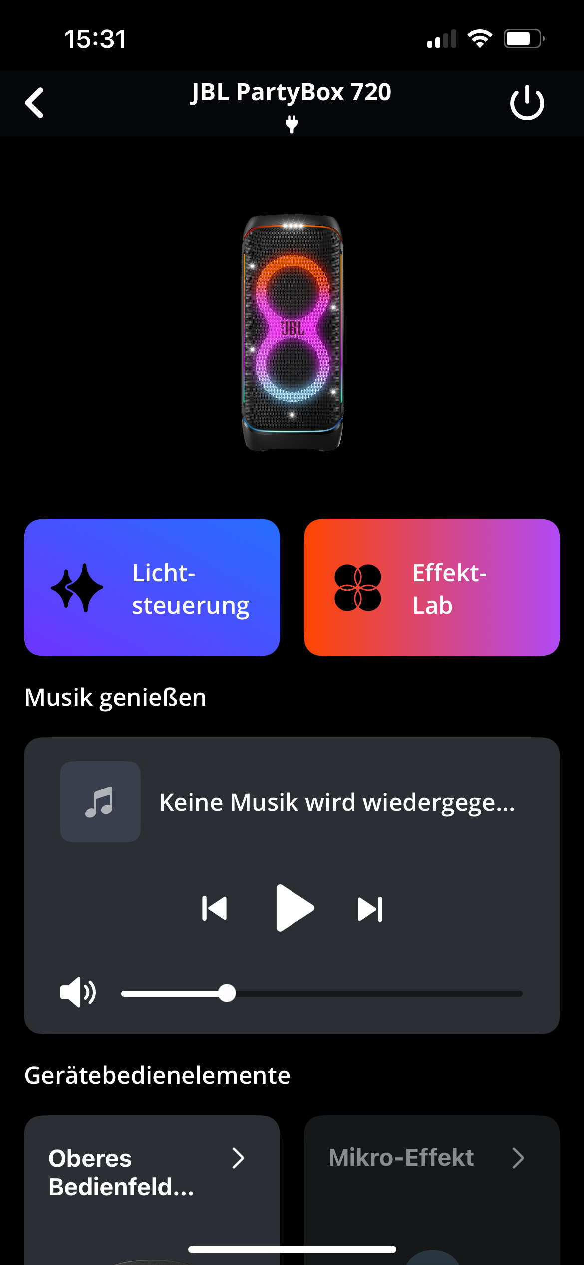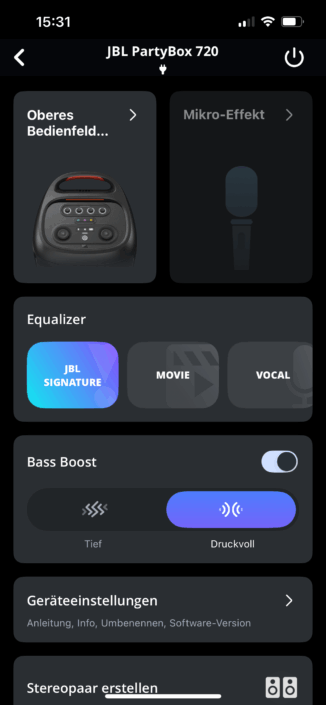 Die JBL-Partybox-App bietet dir viele weitere Steuerungs- und Einstellungsoptionen. Du kannst z. B. die Funktionsweise der Tasten auf deine Bedürfnisse anpassen und einen ausführlichen Equalizer nutzen.