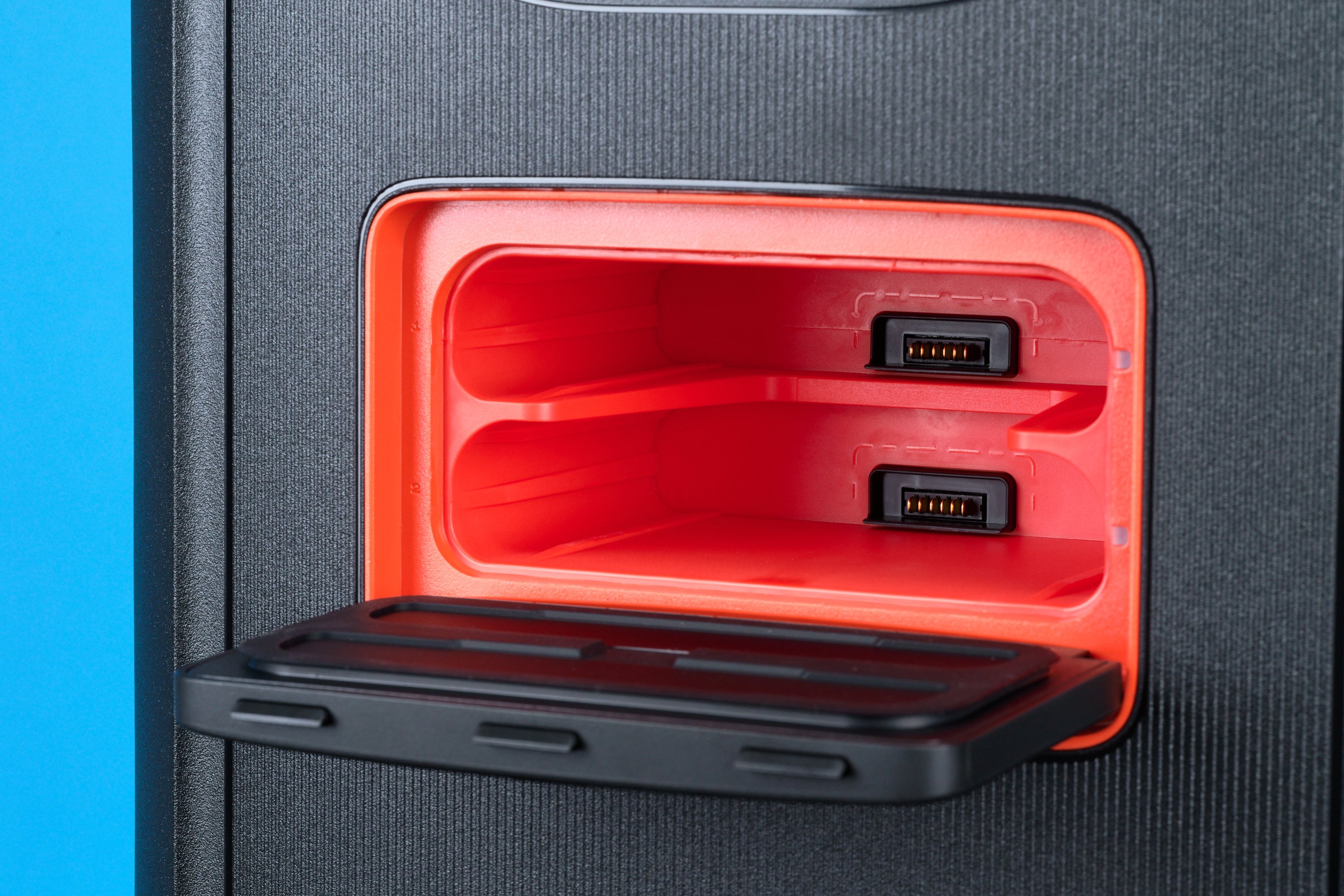 Zumindest auf dem Papier. Denn die Partybox 720 verfügt tatsächlich über gleich zwei Akkufächer. Diese bleiben allerdings ab Werk leer. Prinzipiell kannst du die Box dadurch dennoch unterwegs nutzen – allerdings nur gegen einen erheblichen Aufpreis von knapp 200 Euro. Denn so viel kostet das passende Akku-Paar namens „Battery 600 Duo“ im JBL-Onlineshop. Das Paket enthält auch eine Ladestation, in der du die Akkus außerhalb der Box aufladen kannst.