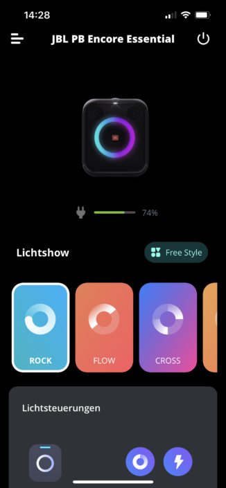 In der App kannst du noch weitere Einstellungen vornehmen. Du findest hier z. B. einen umfangreichen Equalizer, weitere Optionen für die Lichtsteuerung sowie das sogenannte „Effekt Lab“. Hier kannst du auf die Wiedergabe DJ-Effekte wie Wipeout oder Echo anwenden. Außerdem kannst du Sound-Effekte wie Jubel oder Tröten abspielen.