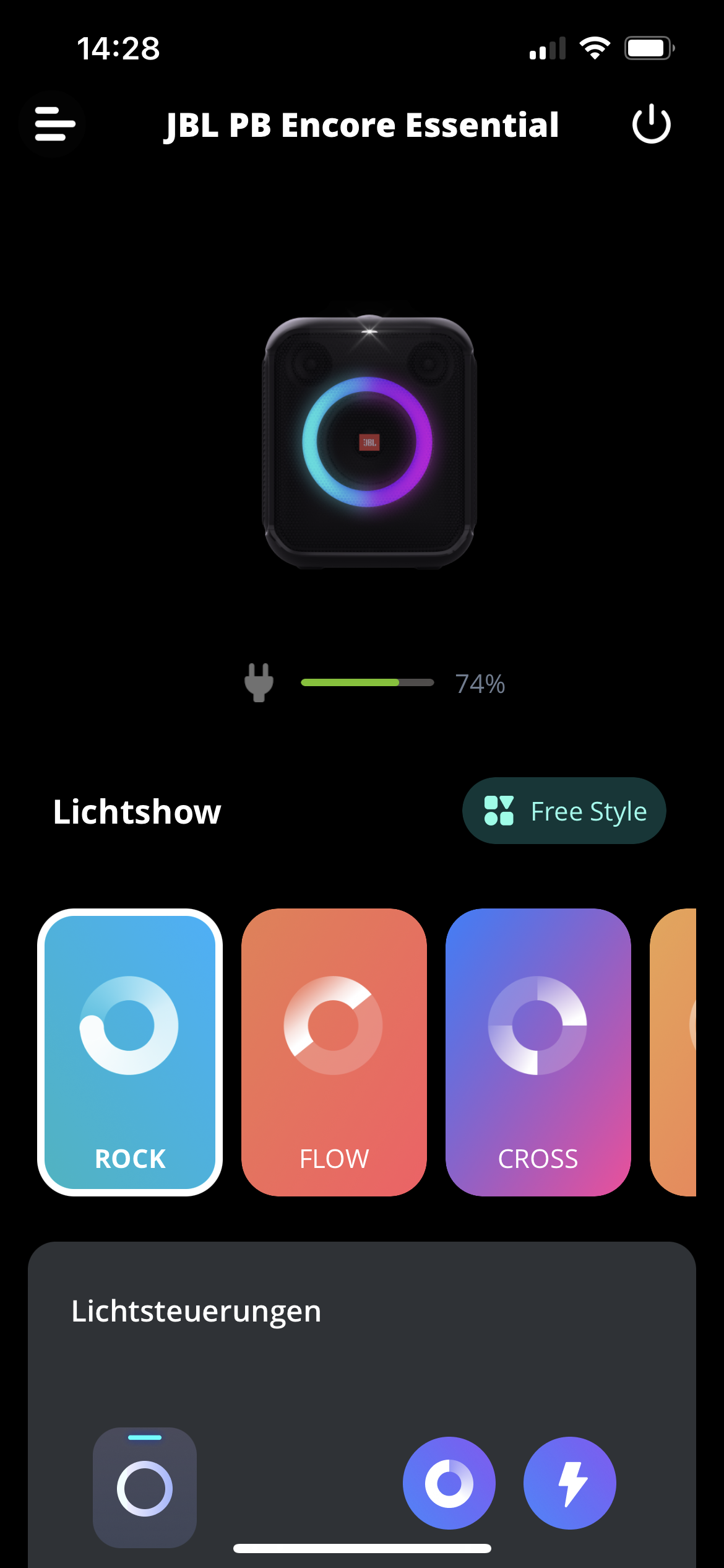 Die JBL Partybox Encore Essential 2 hat nur wenige Bedienelemente. Sie sitzen beleuchtet und dadurch auch im Dunkeln gut sichtbar auf der Oberseite. Ein Drehrad und ein Knopf kümmern sich um die Musik-Steuerung: Du kannst pausieren, Lieder überspringen sowie lauter und leiser stellen. Ein weiterer Drehregler wechselt das Muster der Lichtshow. Dir stehen verschiedene kreisende, blinkende und blitzende Effekte zur Verfügung, von denen sich die meisten im Takt der Musik bewegen. Wahlweise kannst du die Lichtshow auch ganz ausschalten.