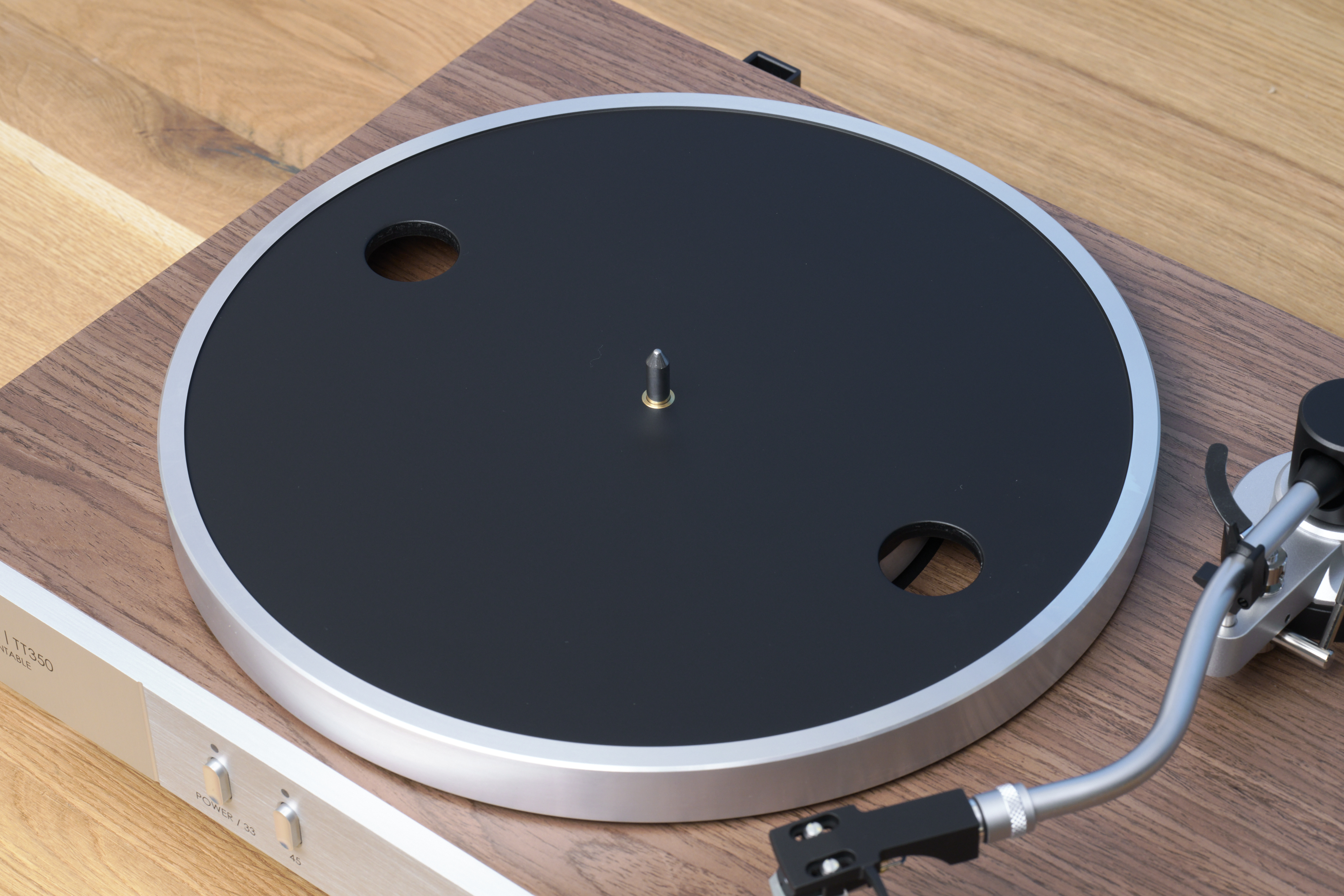 Auf der Motorachse steckt ein überraschend schwerer, präzise bearbeiteter Teller aus Aluminium – noch eine Parallele zum Thorens. Der Teller wiegt etwas unter 1,6 Kilo – oder knapp darüber, wenn du die griffige Gummimatte mitwiegst. Anders als Disco-Direktantriebe lässt sich der Motor etwas Zeit, um diese Masse in Bewegung zu versetzen. Nicht, weil er nicht schneller könnte – das Drehmoment wäre wohl vorhanden. Sondern, weil JBL der Steuerung eine Art Softstart programmiert hat.