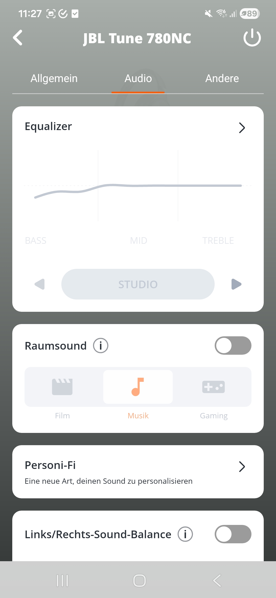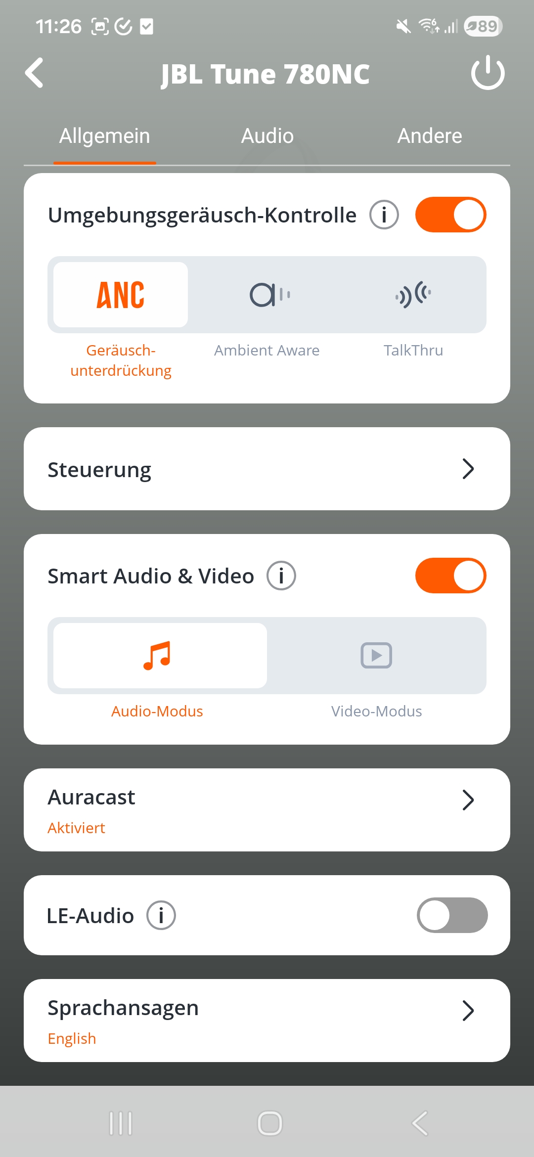 Seine wichtigste Funktion – die Musikwiedergabe – erfüllt der JBL Tune 780 NC also ohne, dass du zum Handy greifen musst. JBLs Steuerungs-App, „JBL Headphones“, ist dennoch einen Blick wert. Hier kannst du z. B. LE Audio und Auracast einschalten oder einen speziellen Modus aktivieren, der auf Kosten der Audioqualität die Latenzzeit verbessert. In der App findest du außerdem einen ausführlichen Equalizer sowie die Möglichkeit, dir über einen kurzen Hörtest ein ganz persönliches EQ-Profil erstellen zu lassen.