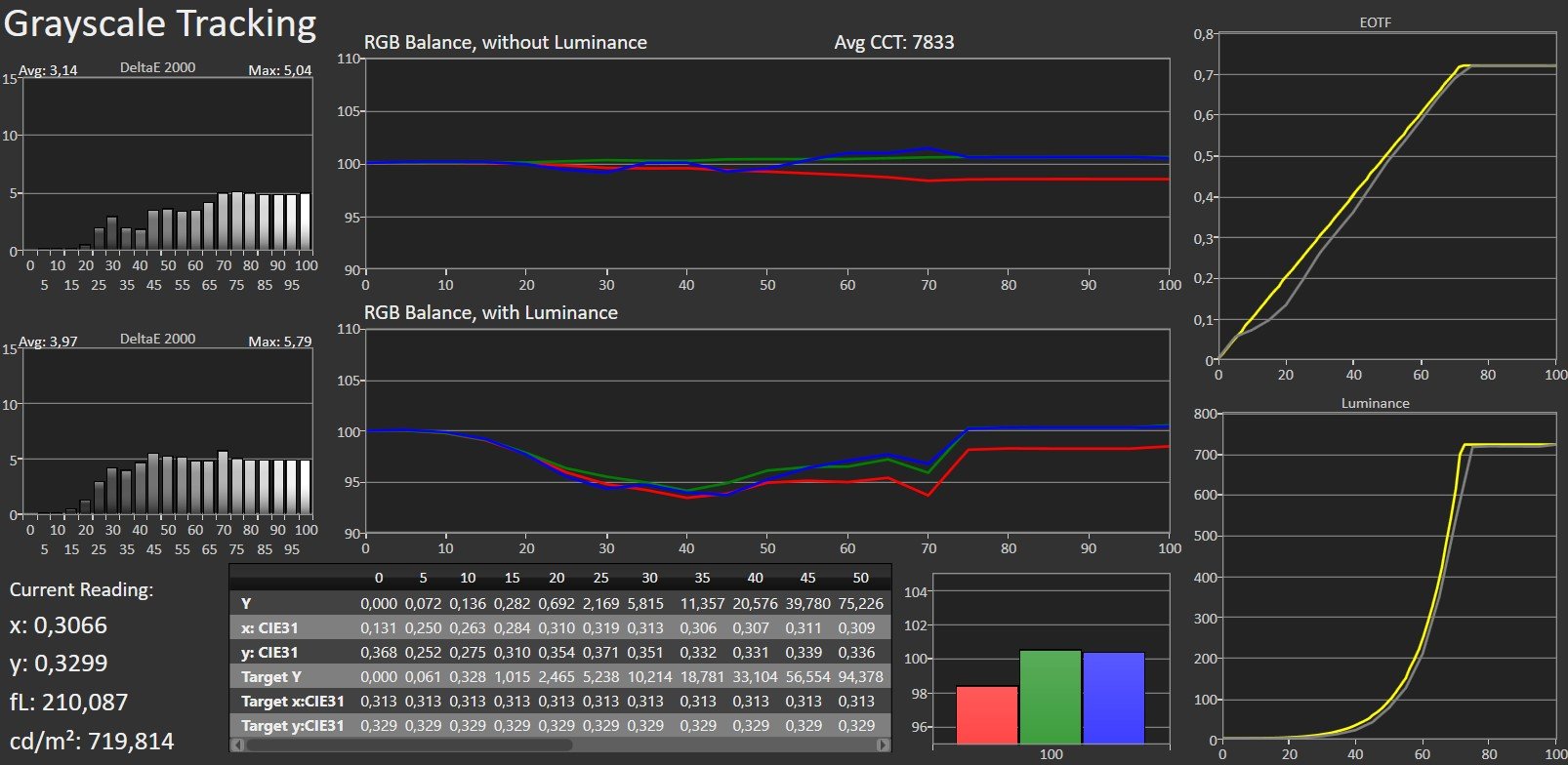 - Spitzenhelligkeit (HDR): 719 Nits (Modus Filmmaker, 10%-Fenster)