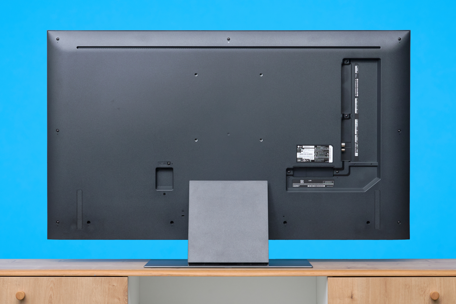 Mit dem zentralen Standfuß steht der LG QNED86 ziemlich stabil. Der massive Standfuß besitzt auf der Rückseite zudem links und rechts zwei Kanäle, um Kabel versteckt abzuleiten. Nur noch die Abdeckung draufstecken und schon sind sie verschwunden.