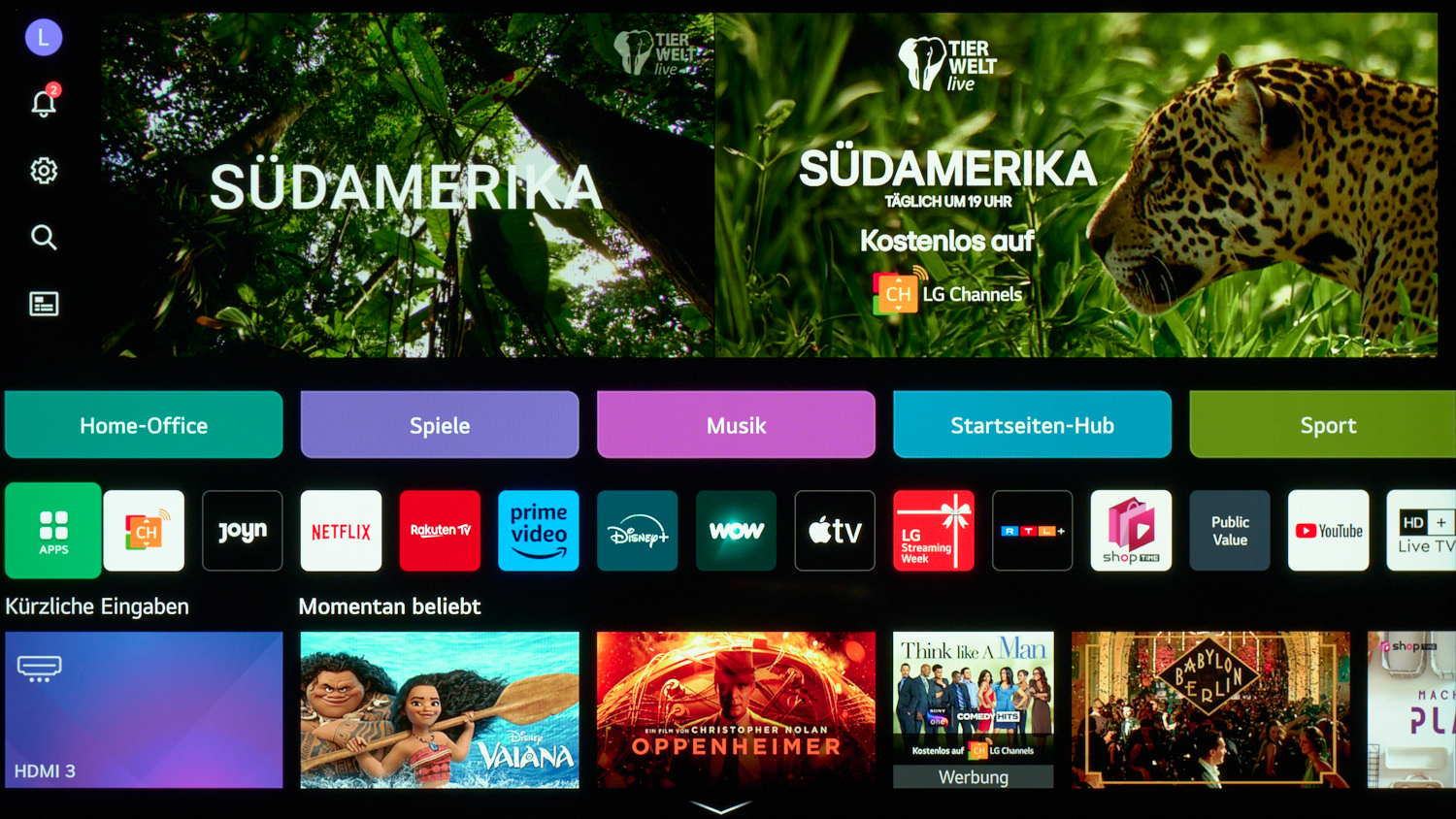 Noch dazu gibt es auf der Startseite Karten, die Inhalte zu verschiedenen Themen sammeln. So dürften sowohl Zocker:innen als auch Musik-Fans schnell die passenden Inhalte finden. Ganz frei von Werbung in Form von Inhaltsvorschlägen ist LGs Smart-TV-Betriebssystem natürlich nicht, es fällt aber weniger auf als beispielsweise bei Samsung-Fernsehern, etwa dem Samsung Q70D.