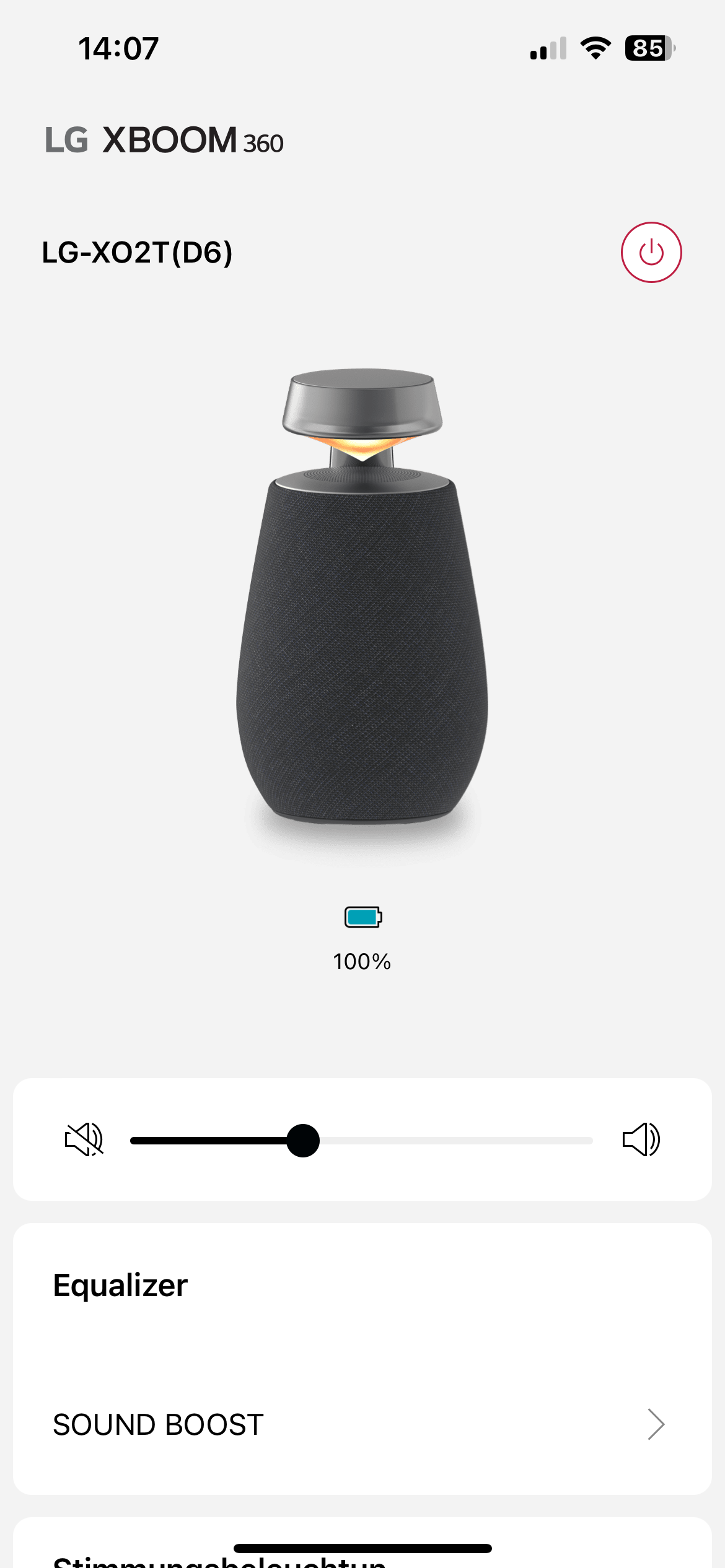 Natürlich haben wir beim Testen der App erst einmal ein neues Softwareupdate für den XBOOM 360 DXO2T heruntergeladen. Dabei musst du dich minimal gedulden, denn mit knappen 3 Minuten gehört das Update nicht zu den flottesten Updates, die wir bisher erlebt haben. Nach dem Update präsentiert sich dir die LG-XBOOM-App aufgeräumt und schlicht. Auf der Übersichtsseite wird dir ein großes Bild des verbundenen Lautsprechers präsentiert und eine kleine Anzeige informiert dich über den Akkustand.