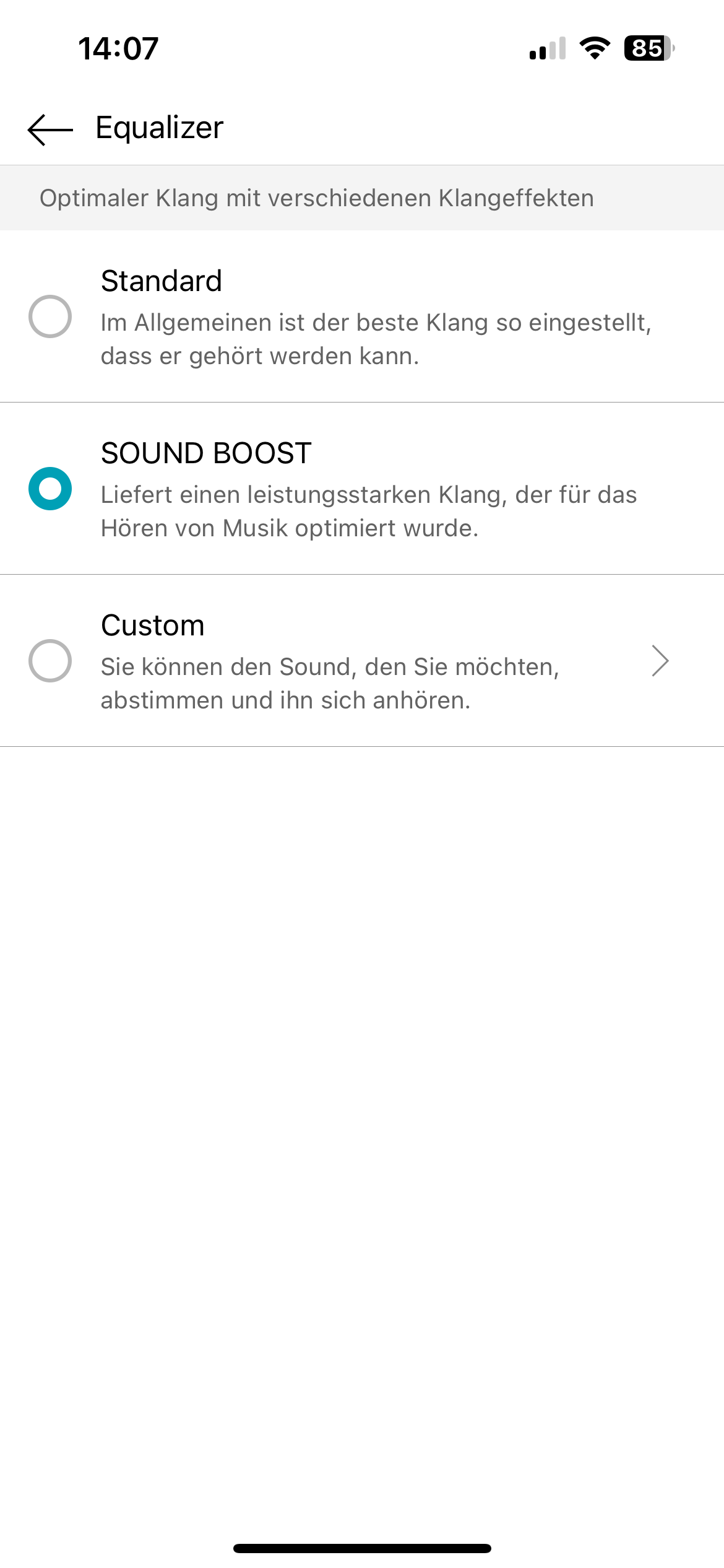 Wir wechseln das Genre und spielen The Magnificent Moon von Mildlife. Und sind zunächst enttäuscht, denn das Gebotene klingt unfassbar dünn. Ein schneller Blick in die Equalizer-Einstellungen der App birgt die Lösung. Denn tatsächlich ist der Standardmodus des DXO2T auf Podcasts ausgelegt. Für Musik muss der „SOUND BOOST“-Modus ausgewählt werden, was auch explizit in den Equalizer-Einstellungen erwähnt ist.