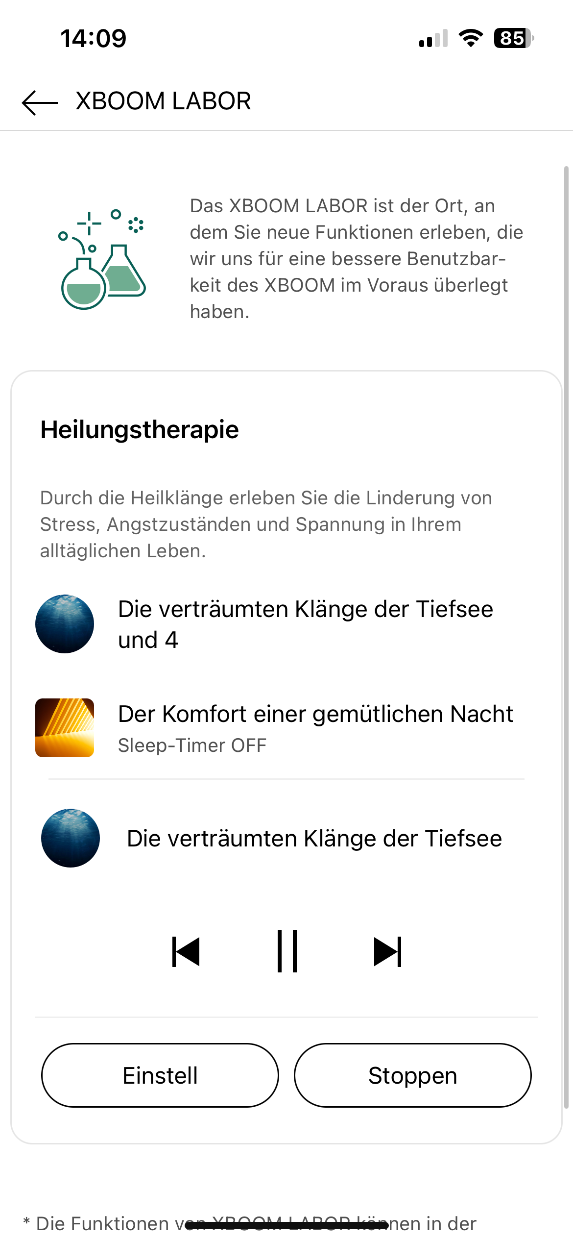 Hier probiert LG nämlich neue Features für den XBOOM 360 DXO2T aus. Momentan kann man hier Ambiente-Funktionen und „Heilungstherapie“ einstellen. Bei der Heilungstherapie kann man sich aus verschiedenen Entspannungsklängen und Beleuchtungsszenarien ein Ambiente erstellen, dass Stress, Spannung und Angstzustände reduzieren soll.