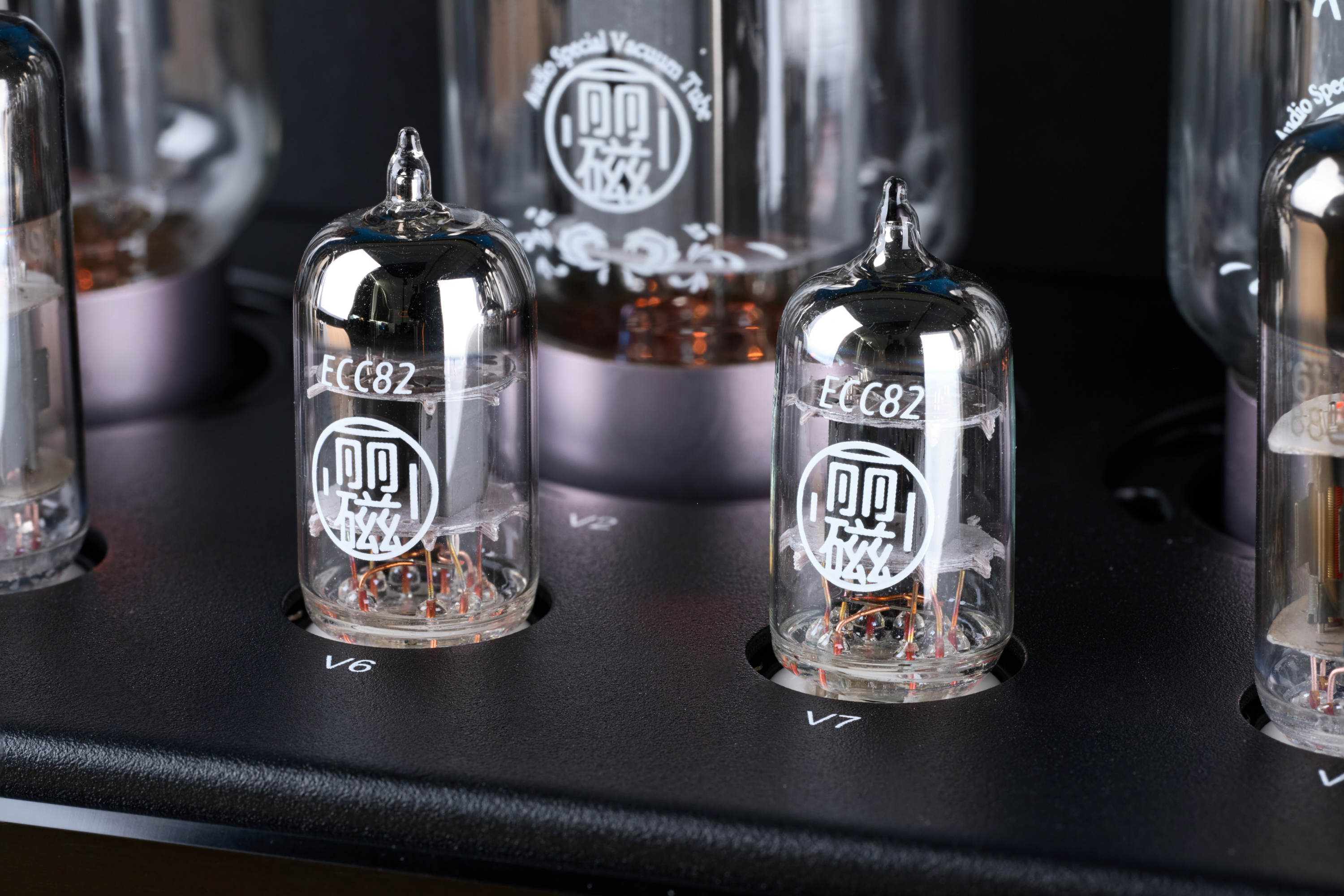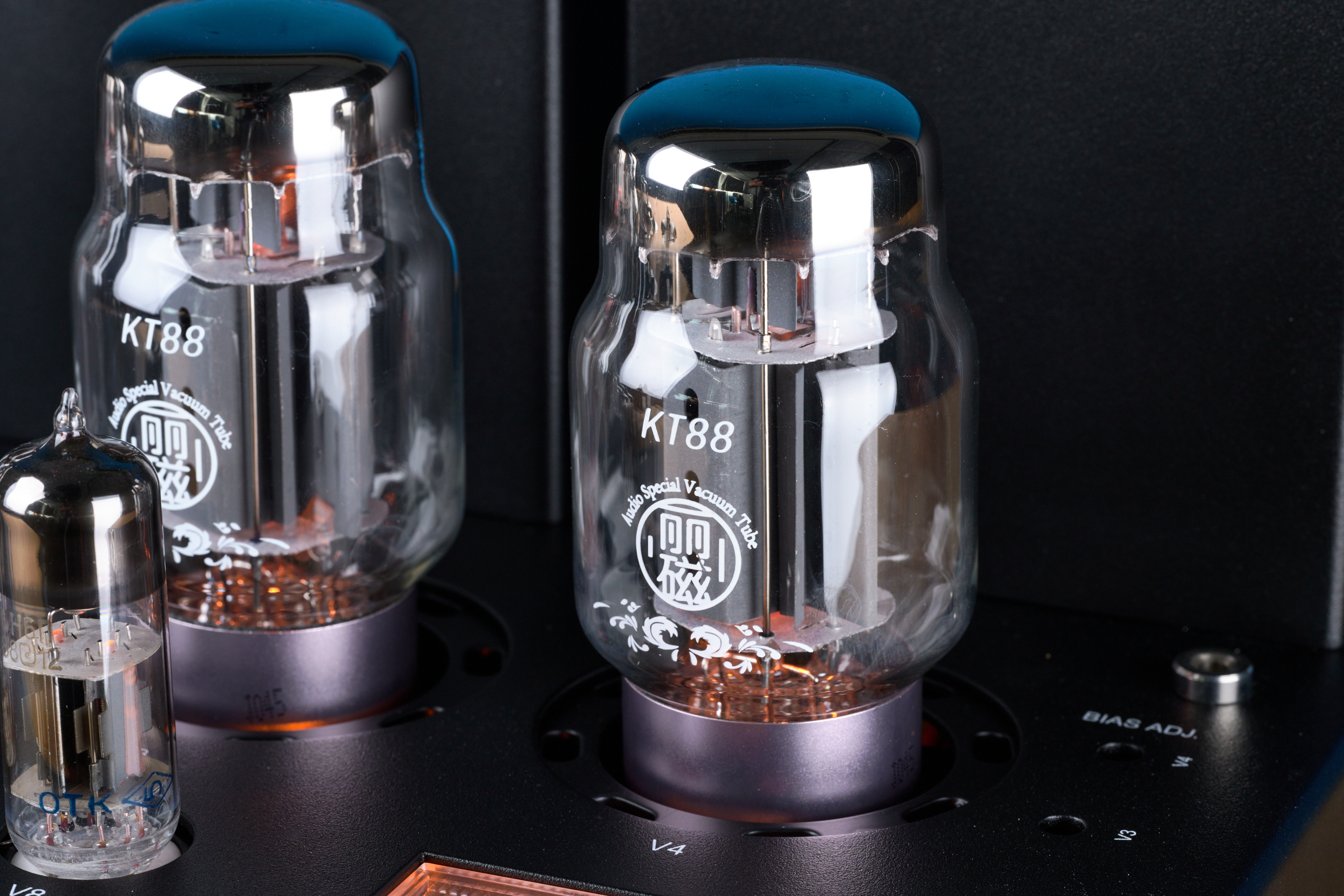 Vor dem KT88-Quartett werkeln vier vergleichsweise zierliche Doppeltrioden für Vor- und Treiberstufe: zwei 12AU7, bzw. ECC82, gefolgt von zwei 6N6P (kyrillisch: 6Н6П) aus alter sowjetischer Produktion. Alles gebräuchliche, gut und in großer Auswahl verfügbare Röhren. Nachschubsorgen musst du dir hier garantiert nicht machen, zumal es für jeden verwendeten Röhrentyp auch noch etliche kompatible Alternativen gibt. Die kleinen Röhren halten aller Voraussicht nach ohnehin fast ewig. Und auch die Leistungsröhren sind für viele Jahre Hörspaß gut. Ab und zu solltest du ihre Ruheströme überprüfen. Dank eingebautem Amperemeter und gut zugänglichen Trimmpotis geht das sekundenschnell.