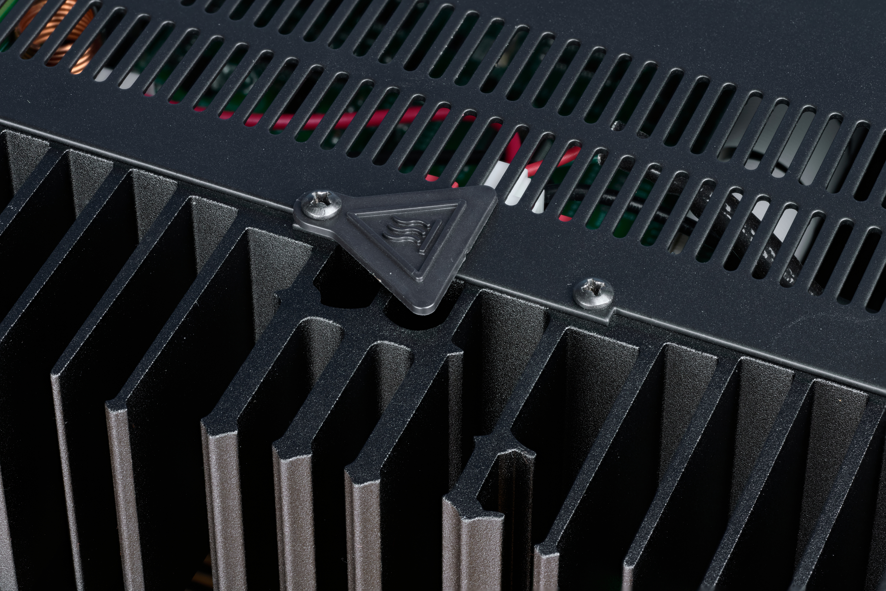 Die beiden Seiten der oberen Kammer bestehen aus Kühlprofilen für die dahinter befindlichen Endstufen: klassische Leistungsstufen der Verstärkerklasse A/B, bestückt mit je zwei Paaren edler ThermalTrak-Transistoren pro Kanal. Dank integrierter, schnell reagierender Temperaturfühler stellen sich diese Halbleiter besonders präzise auf ihre naturgemäß ständig schwankenden Arbeitsbedingungen ein.