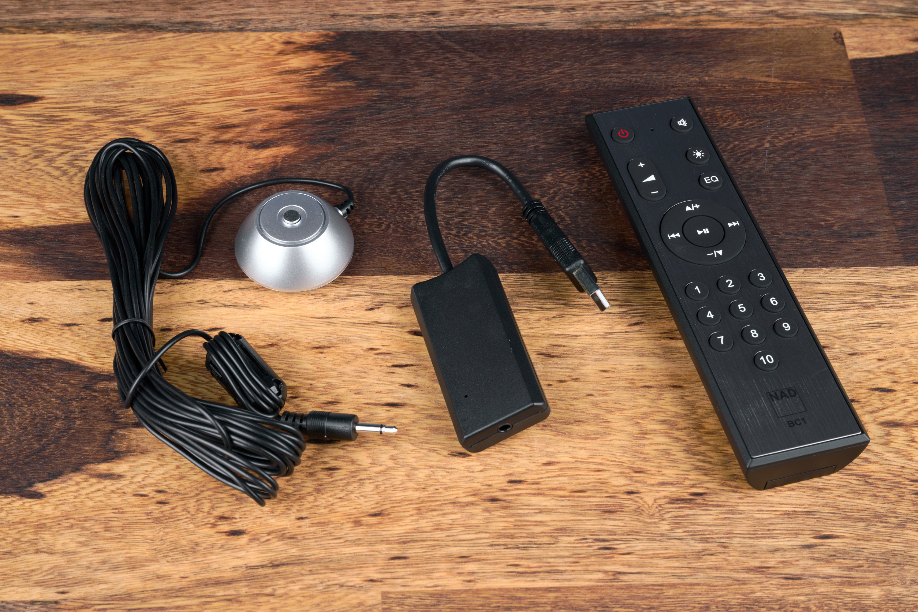 Dieses Material veredelt auch die Oberseite der serienmäßigen IR-Fernbedienung. Falls du darauf die Quellenwahltaste suchst: Die gibt es nicht. Du kannst deine bevorzugten Eingänge, Playlisten oder Radiosender aber als Presets speichern und die ersten zehn dann direkt mit den Zifferntasten auf der Remote abrufen. Ähnlich verhält es sich mit dem Kopfhörerausgang: Zwar gibt es tatsächlich keine physische Kopfhörerbuchse, der NAD kann die Musik aber per aptX HD an Bluetooth-Kopfhörer funken. Konsequent modern also – wie alles an diesem Streaming-Amp.