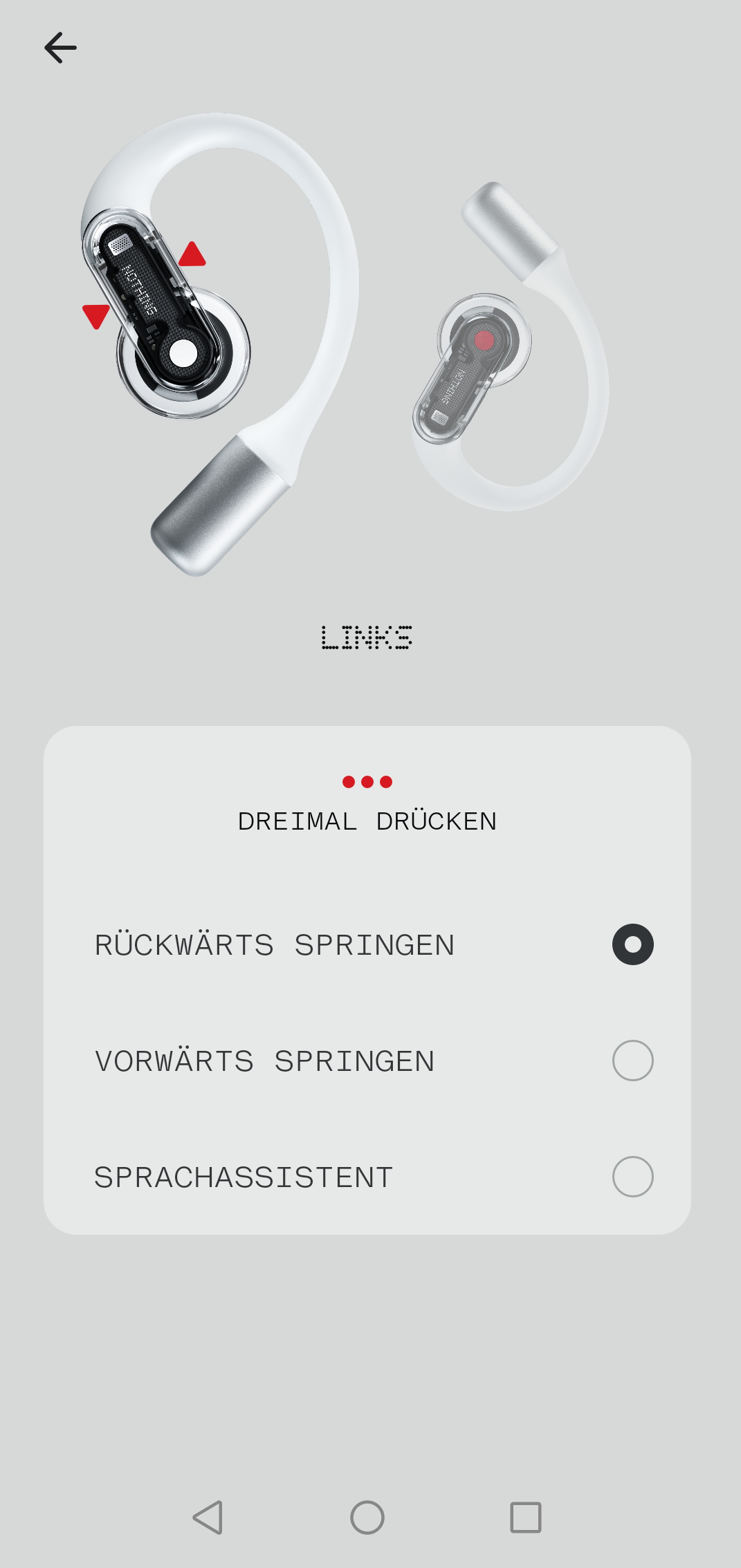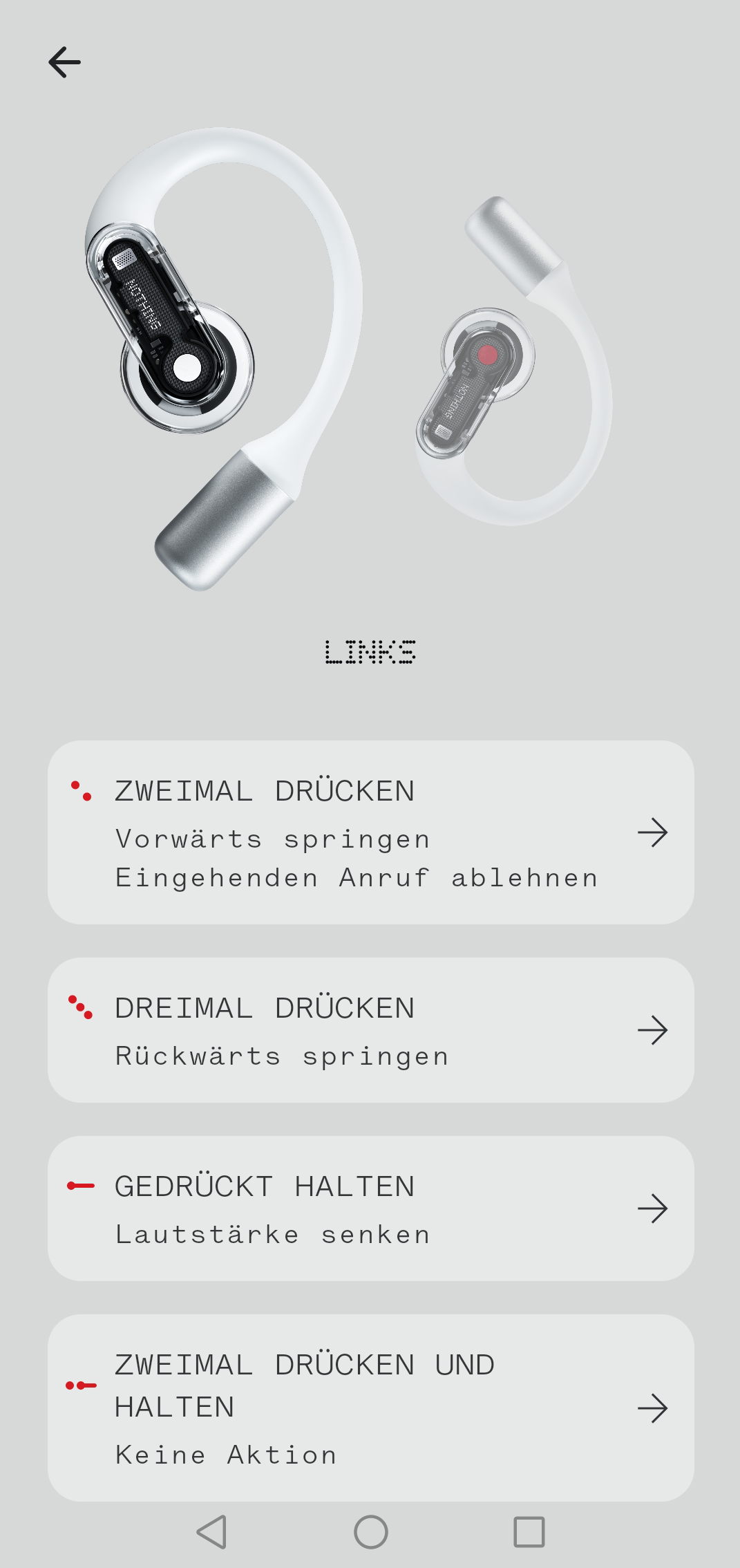 Hier bietet die Nothing X-App jedenfalls etwas individuellen Spielraum bei der Einrichtung. Einfaches Drücken ist zwar starr der Wiedergabe- und Anrufsteuerung zugeordnet, zweifaches, dreifaches und langes Drücken lassen sich aber entweder einem Sprachassistenten, dem Vor- und Zurückspulen oder der Lautstärkeregelung zuordnen. Linker und rechter Bud agieren autonom, du kannst die Bedienung also so anpassen, dass sie dir intuitiv erscheint.