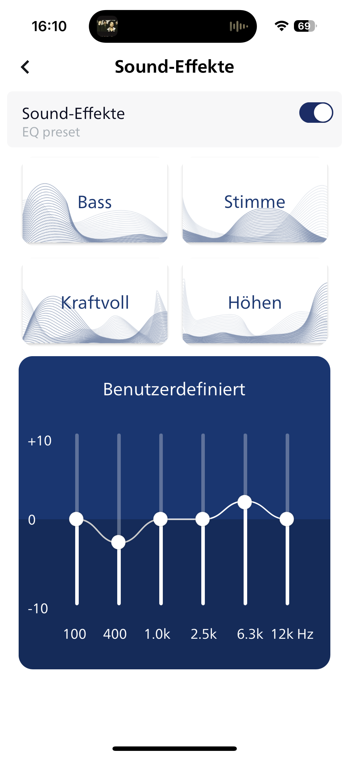 Die App von Philips hört auf den wenig fantasievollen Namen „Kopfhörer“ und eignet sich für alle Bluetooth-Kopfhörer von Philips und eben auch für die Fidelio T1 und T2. Auf der Startseite der App erhältst du Informationen zum Ladezustand des Cases und der beiden Hörer und du kannst hier das ANC aktivieren und dann wahlweise auf Transparenz oder Automatik stellen. Du kannst hier auch Soundeffekte aktivieren. Darunter versteht Philips vier voreingestellte Presets (Bass, Stimme, Kraftvoll, Höhen) und einen benutzerdefinierten EQ mit 6 Frequenzbändern.