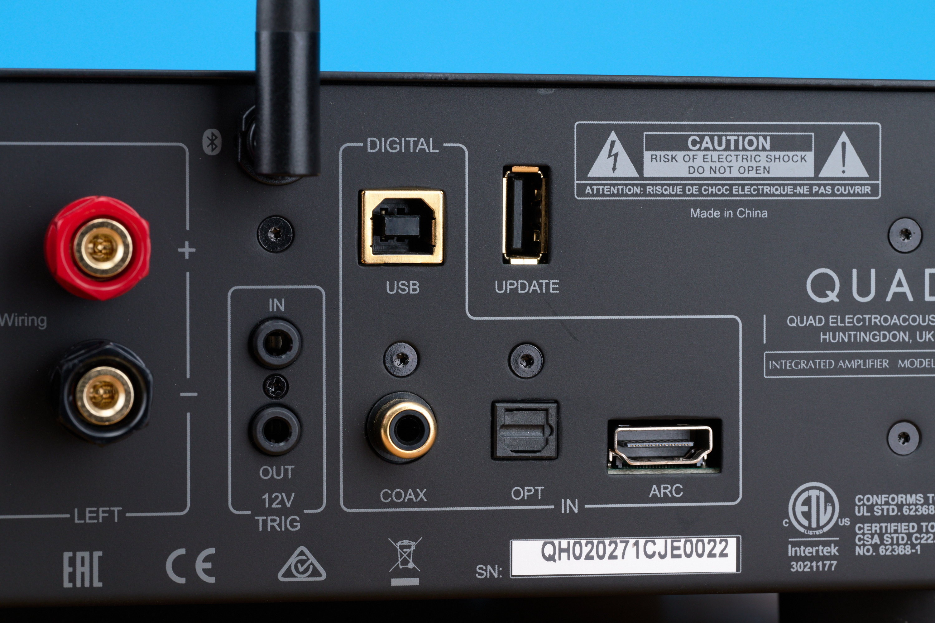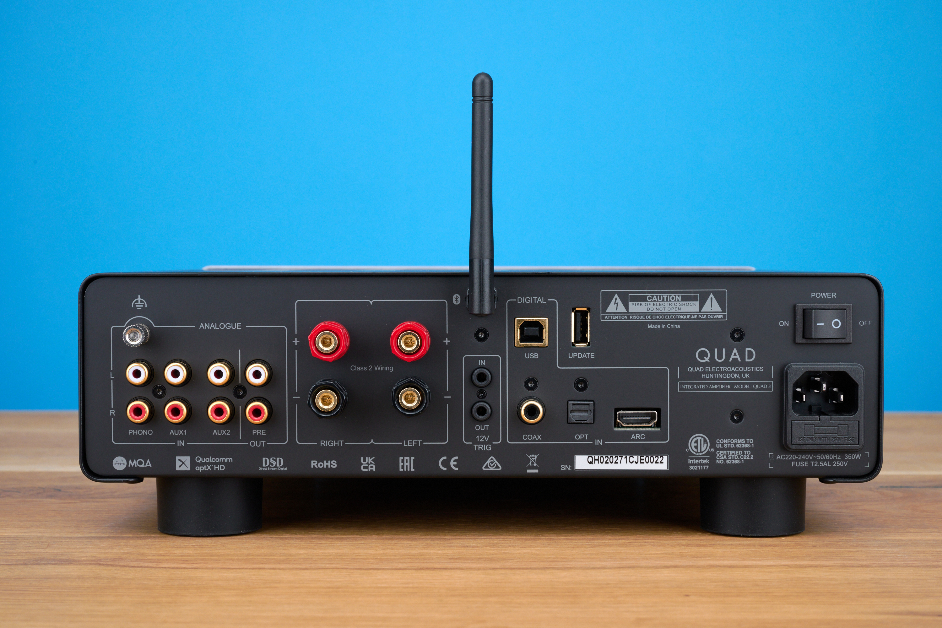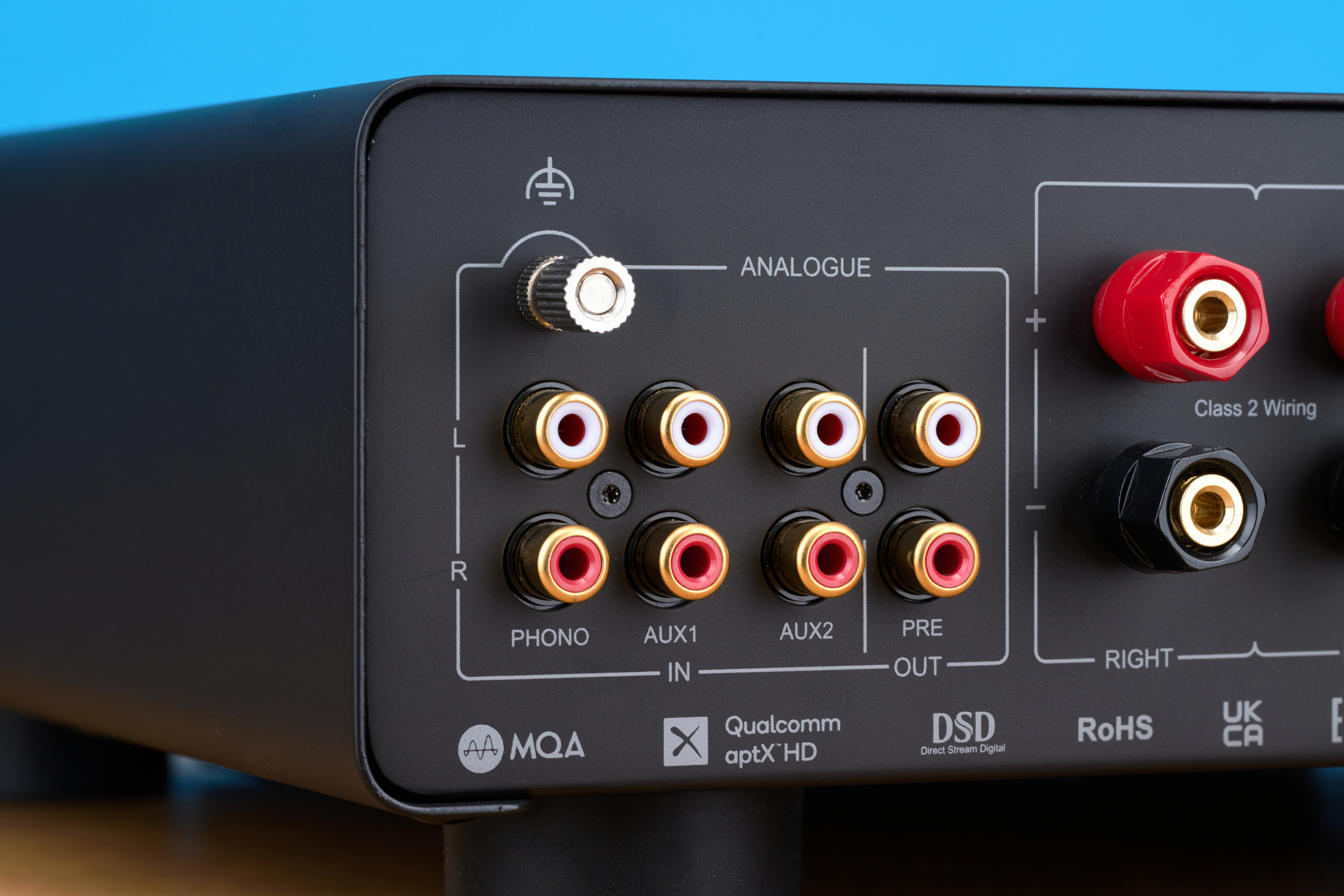 Hinzu kommt für den digitalen Alltagskomfort ein HDMI-ARC-Eingang, über den sich der Quad deinem Fernseher als Tonausgabe unterordnet und dessen Fernbedienung gehorcht. Auch wireless kannst du mit dem Verstärker Kontakt aufnehmen. Bluetooth aptX HD sorgt dabei für nahezu verlustfreien Klang. Auf der analogen Seite des Anschlussfelds winkt als Erstes ein Phono-Eingang mit hohen 47dB Gain und – für die meisten MM-Systeme – optimalen 100pF Abschlusskapazität.