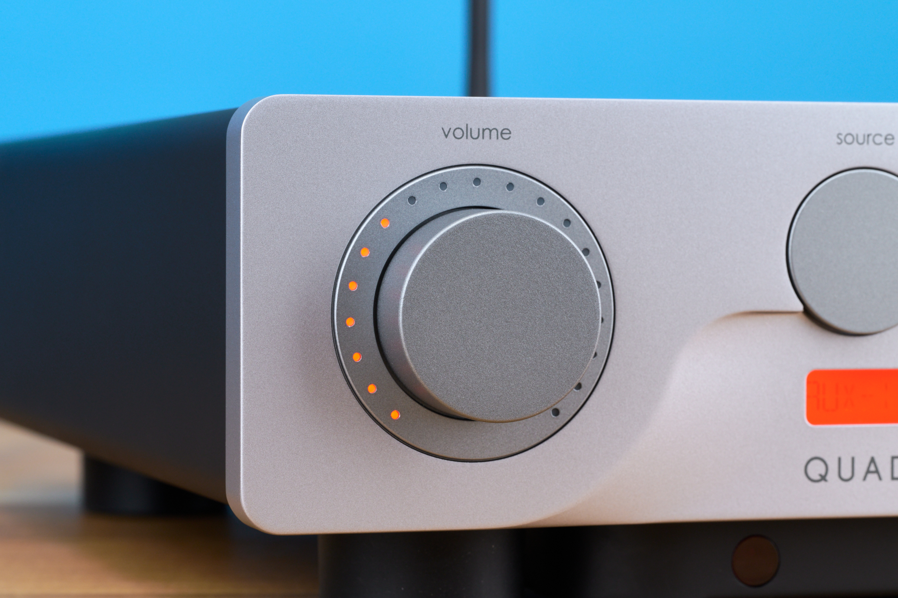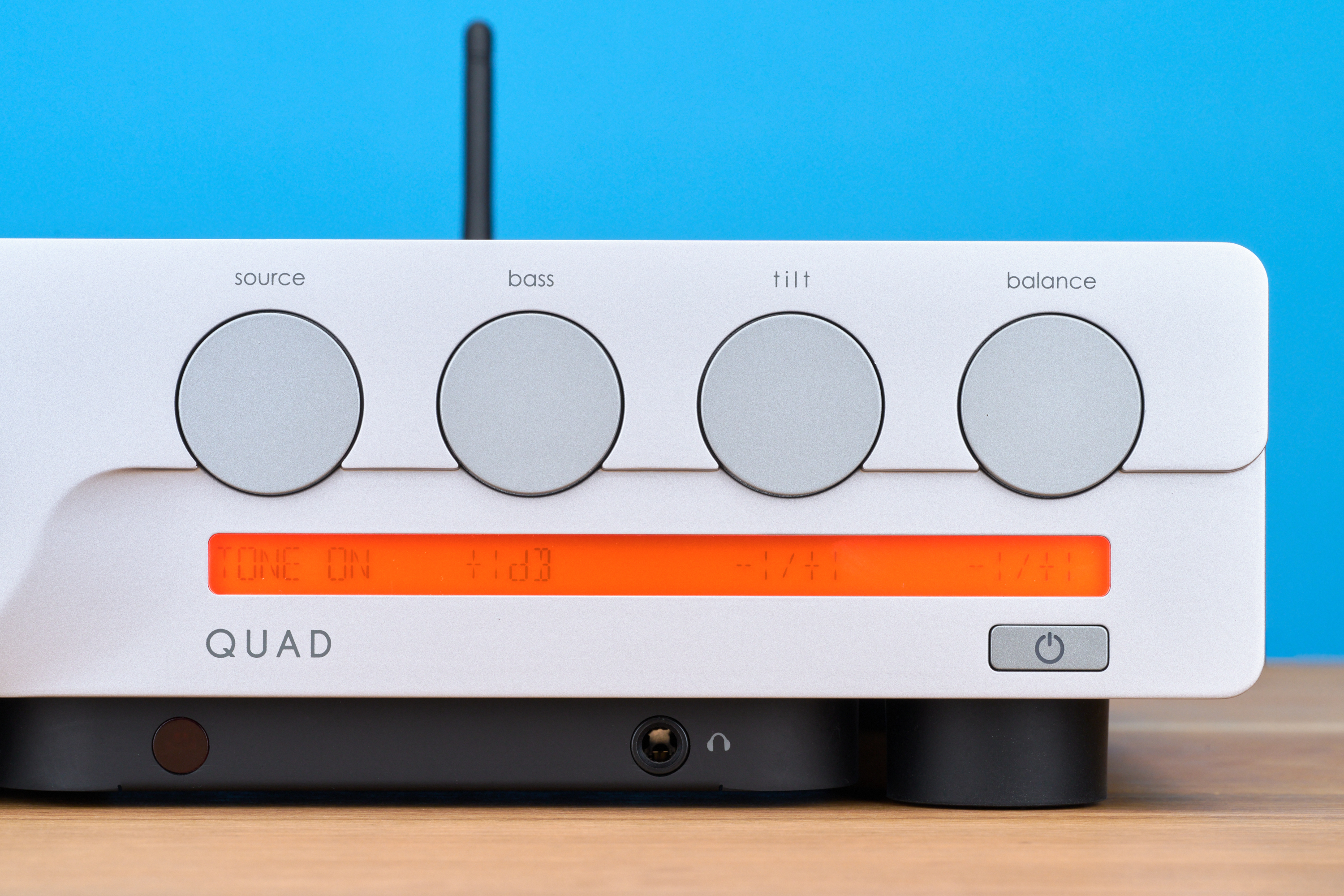 Die – natürlich umgehbaren – Klangregler bergen eine alte Quad-Spezialität: Statt Bass und Höhen dosierst du hier Bass und Tilt. Letzteres arbeitet ähnlich wie die Klangwaagen an alten Röhrenradios: Drehst du den Knopf nach rechts, hebst du tiefe Frequenzen an und senkst die Höhen gleichzeitig ab. Drehst du nach links, passiert das genaue Gegenteil. Und zwar nicht nur punktuell, sondern breitbandig, als würdest du den kompletten Originalfrequenzgang – der linealgerade ist – um einen bestimmten Punkt kippen.