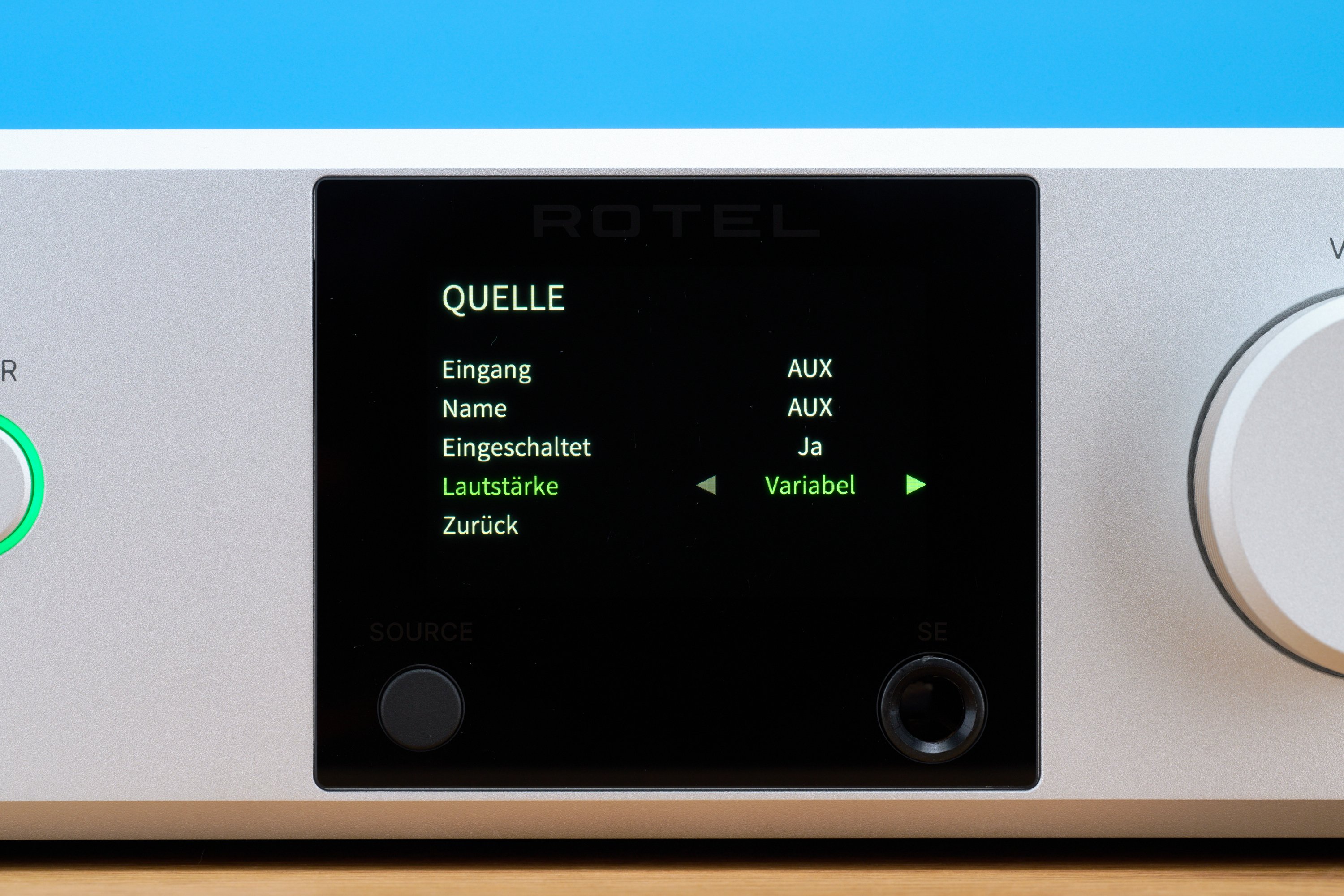 Am Heck gibt es neben den erwähnten Eingängen solide, isolierte Schraubklemmen für ein Paar Lautsprecher, sowie einen Subwoofer-Ausgang. Kopfhörer steckst du an der 6,3-mm-Buchse an der Frontplatte ein. Der Volume-Drehknopf daneben ist das einzige Bedienelement direkt am Gerät. Weitere Funktionen erreichst du mit der schönen Vollmetall-Fernbedienung über ein in winziger Schrift dargestelltes Menü, aber es sind nicht viele: Du kannst jeden Eingang umbenennen, für jeden die Volume-Regelung deaktivieren und gar nicht benötigte Inputs ausblenden. Im Audiomenü gibt es einen Balanceregler, aber keine Klangregelung.