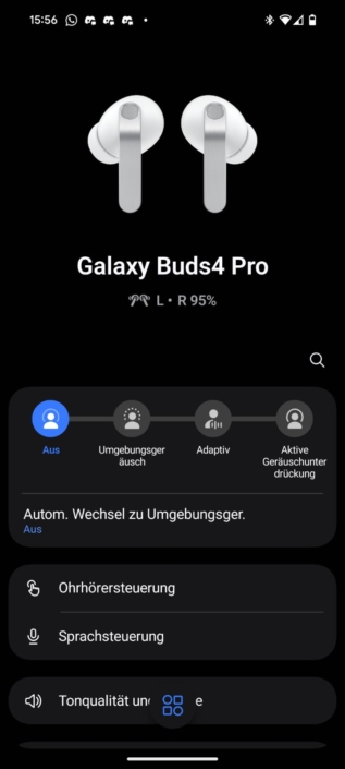 Und hier dürften besonders der Equalizer und die Bedienung interessant sein. Ersterer hebt die Galaxy Buds4 Pro klar von Apples AirPods Pro 3 ab, die verfügen nämlich nicht über einen komplett manuellen EQ – auch nicht mit iOS-Gerät. Bei Samsung hingegen kannst du dich im Neun-Band-EQ frei austoben oder voreingestellte Presets verwenden. Einziges Manko: Der Equalizer versteckt sich hinter dem Menüpunkt „Tonqualität und Effekte“ und lässt sich nicht direkt auf der Startseite befestigen. Das ist aber natürlich verschmerzbar.