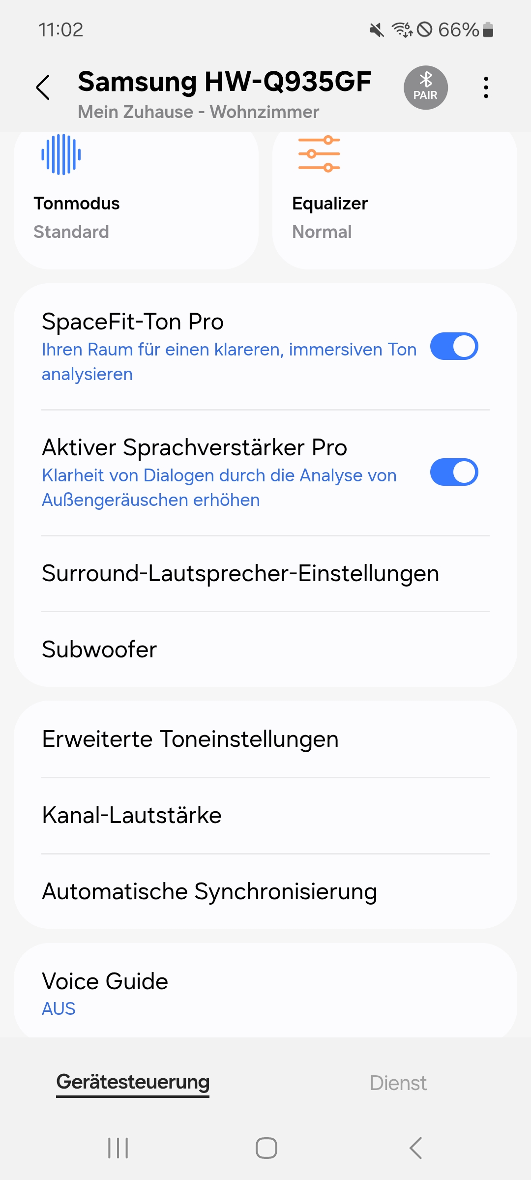 Alles Weitere nimmt dir Samsung letztlich ab. Anpassungen der Pegel waren in unserem Fall nicht nötig, eine Einmessung findet automatisch statt – und das täglich. Dabei werden Klang und Raum aufeinander abgestimmt. Die Option heißt SpaceFit-Ton Pro, falls du sie doch einmal deaktivieren möchtest. Natürlich kannst du in der App aber die Tonmodi bequem durchprobieren oder die aktive Sprachverstärkung ein- oder ausschalten.
