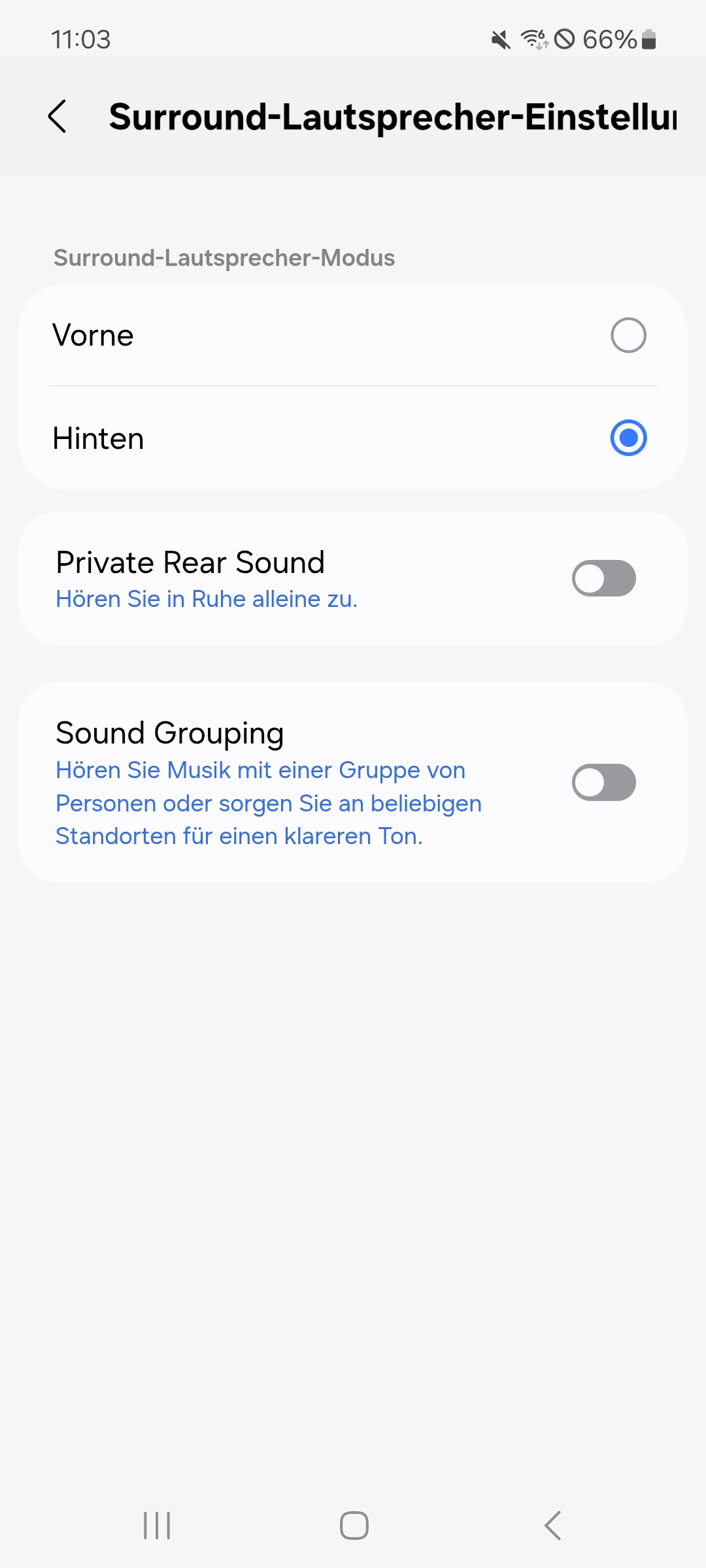 Zum einen hast du die Möglichkeit, die Rears ganz allein spielen zu lassen – ohne Subwoofer oder Soundbar. Das hat den Vorteil, dass du etwa nachts niemanden störst. Der Klang ist ganz nah bei dir und muss nicht laut aufgedreht werden. Muss es nicht ganz so leise sein, kannst du in den erweiterten Toneinstellungen der App sonst aber auf den herkömmlichen Nacht-Modus zurückgreifen, der einige Frequenzen begrenzt. Oder – gegebenenfalls sogar zusätzlich – den Bass mäßigen. Der Subwoofer ist dann stumm, die Soundbar übernimmt seine Aufgabe.