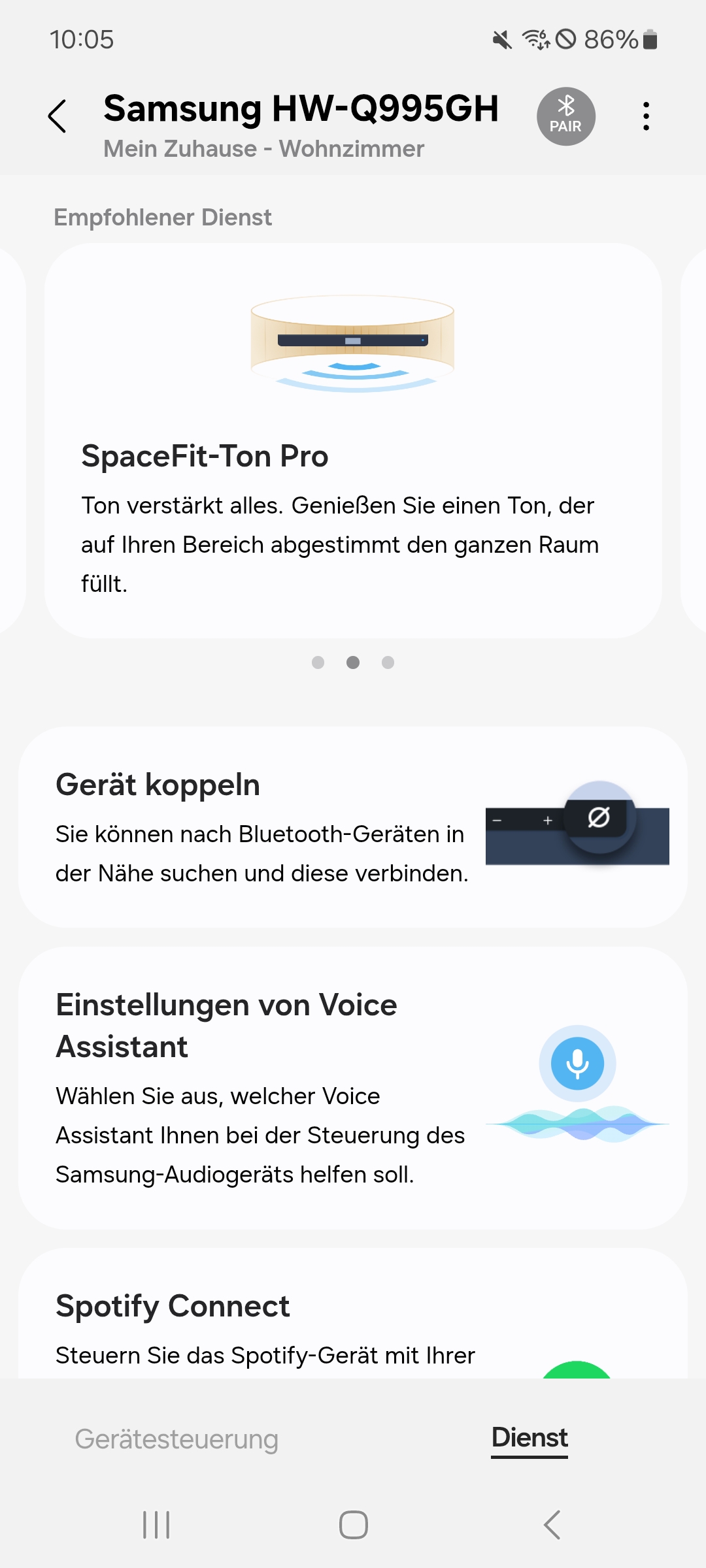 SpaceFit-Was? Bei dem Feature mit dem etwas kryptischen Namen handelt es sich um eine automatische Einmessung, die täglich den Klang des Sets auf deinen Raum anpasst. Praktisch, falls du gerne auch mal Möbel verrückst. Das Feature kann, je nach Komplexität des Raumes, einen Unterschied machen, wir würden es daher immer einschalten.