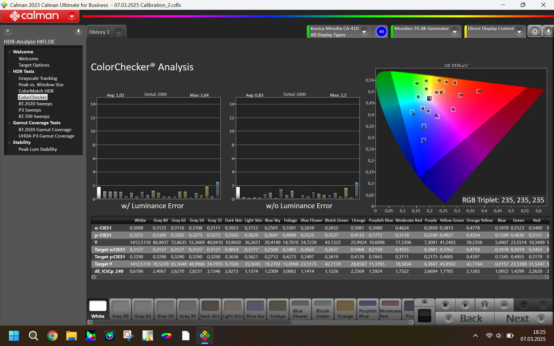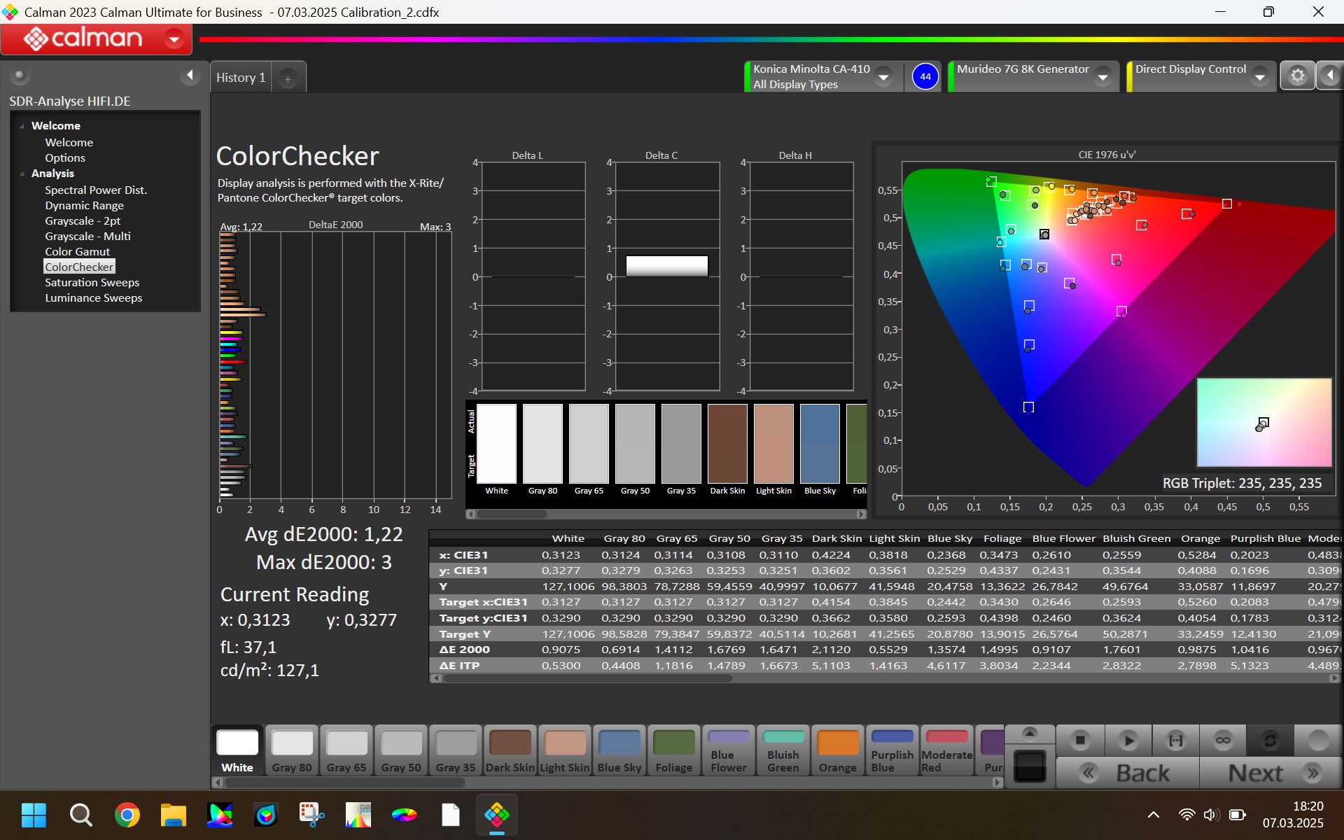 Doch zunächst gehen wir auf die SD-Inhalte wie TV-Sendungen und Full-HD-Streaming ein. Im Bild-Modus Filmmaker entspricht die Farbwiedergabe ziemlich genau den Produktionsstandards für HD-Inhalte und 4K-HDR. Dementsprechend fallen unsere Messungen, die wir mit Calman durchgeführt haben, hervorragend in ihren Ergebnissen aus. Die gemessenen Farbabweichungen liegen selbst beim Vorserien-Muster so gut wie alle unter dem Delta-E2000-Wert 2, also in einem Bereich, wo sie in der Praxis nicht von Bedeutung sind.