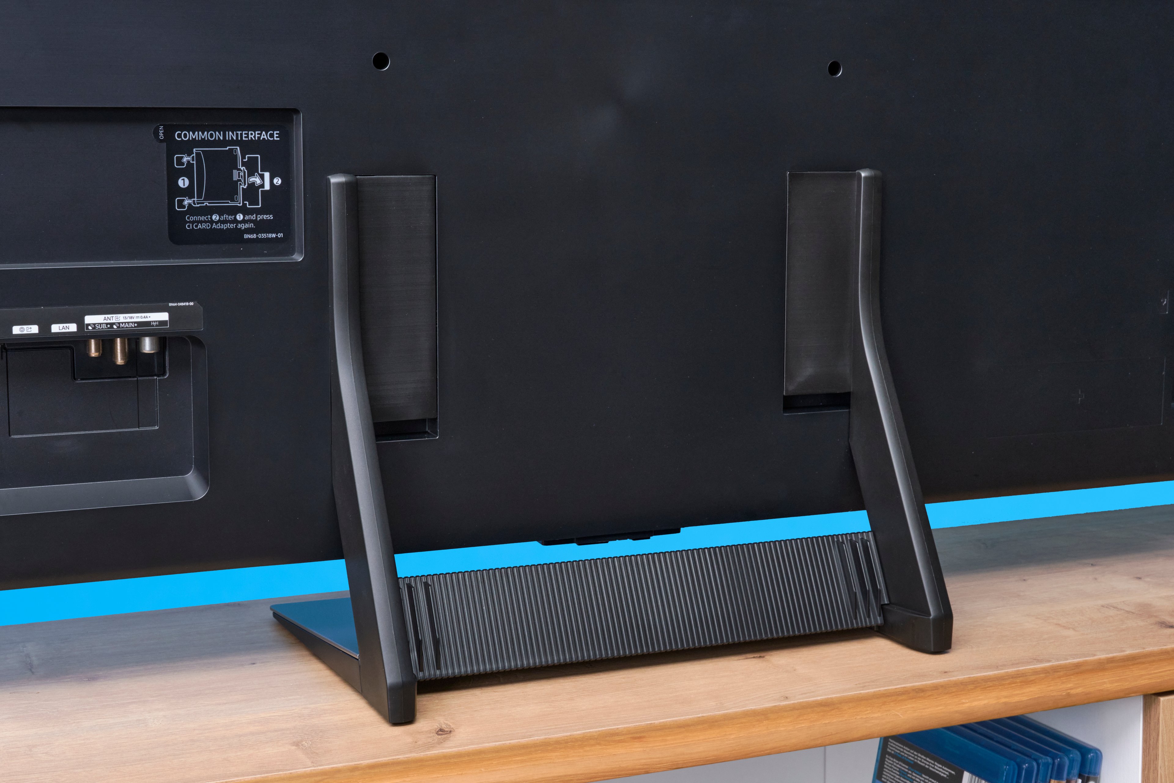 Schon im letzten Jahr hatte der 65 Zoll große GQ65S90D ein QD-OLED-Panel und die anderen Größen WRGB-OLED. Die Bauform hat sich nicht verändert. Ein superschlankes OLED-Panel, dahinter ein kompaktes Gehäuse mit Elektronik und Lautsprechern. Und dazu ein stabiler Standfuß, der ohne Schrauben angebracht wird.