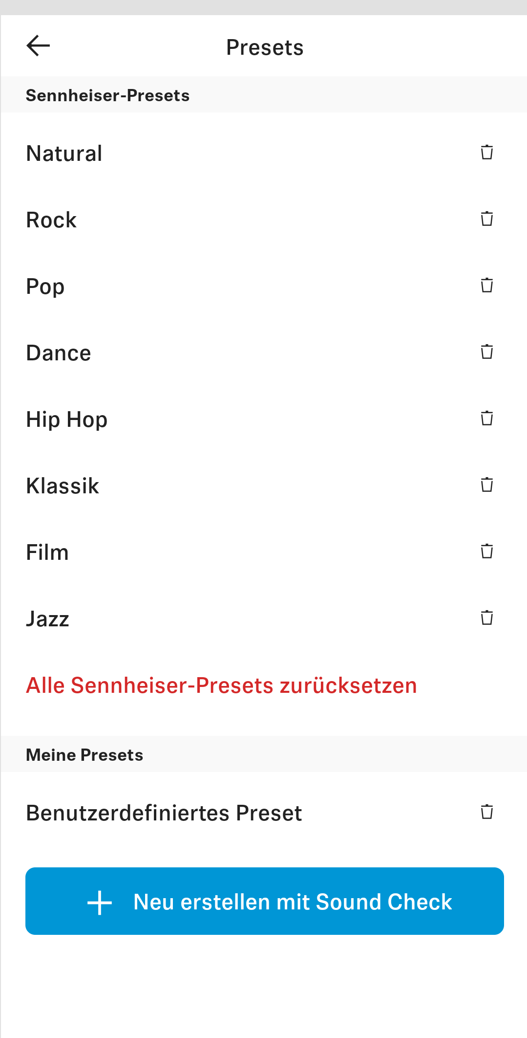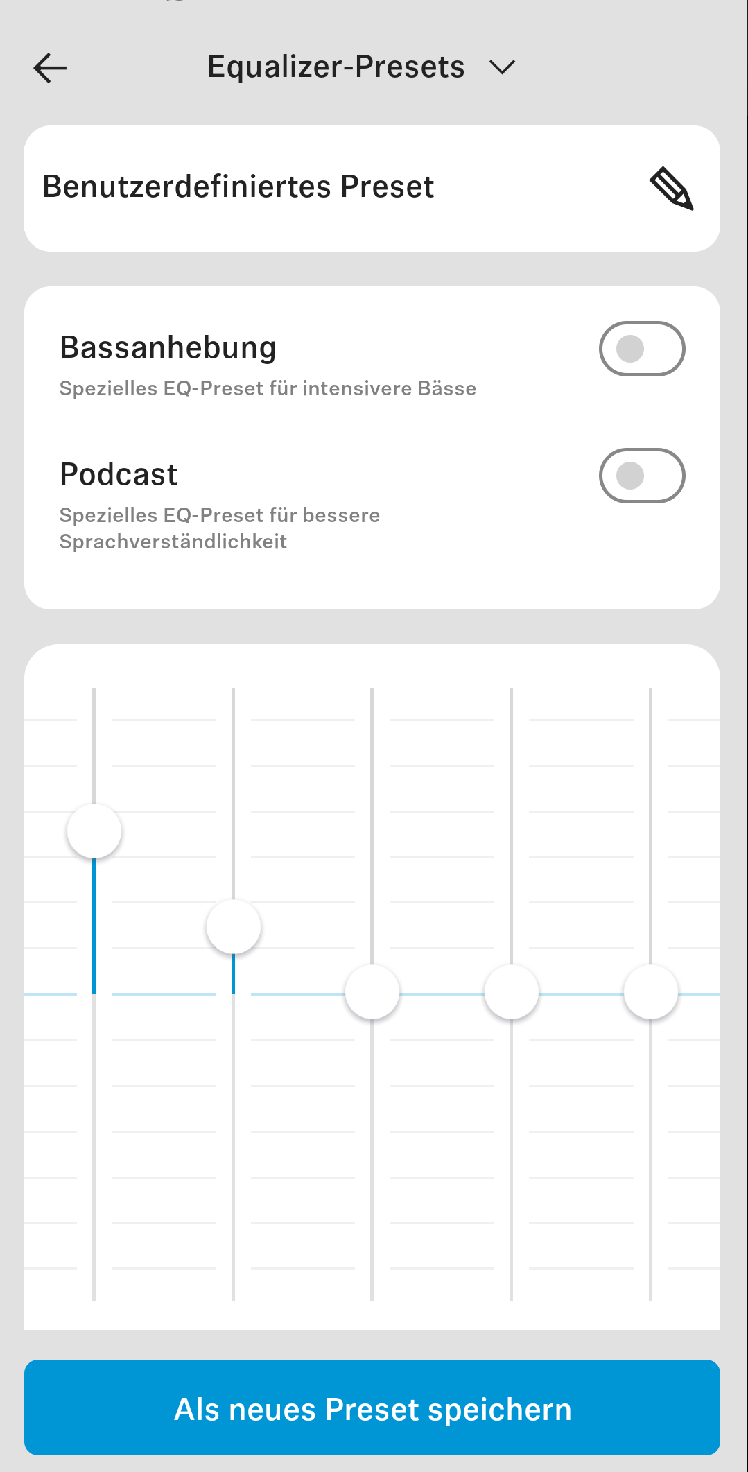 Sport-Version hin oder her, bei der Sound-Personalisierung und sonstigen Features macht Sennheiser in der App kaum Abstriche. Die Smart Control-App, die du mit iOS und Android nutzen kannst, bietet einen Fünf-Band-Equalizer samt vorinstallierter Presets. Natürlich kannst du auch selbst Hand anlegen und dir dein individuelles EQ-Paket zimmern.