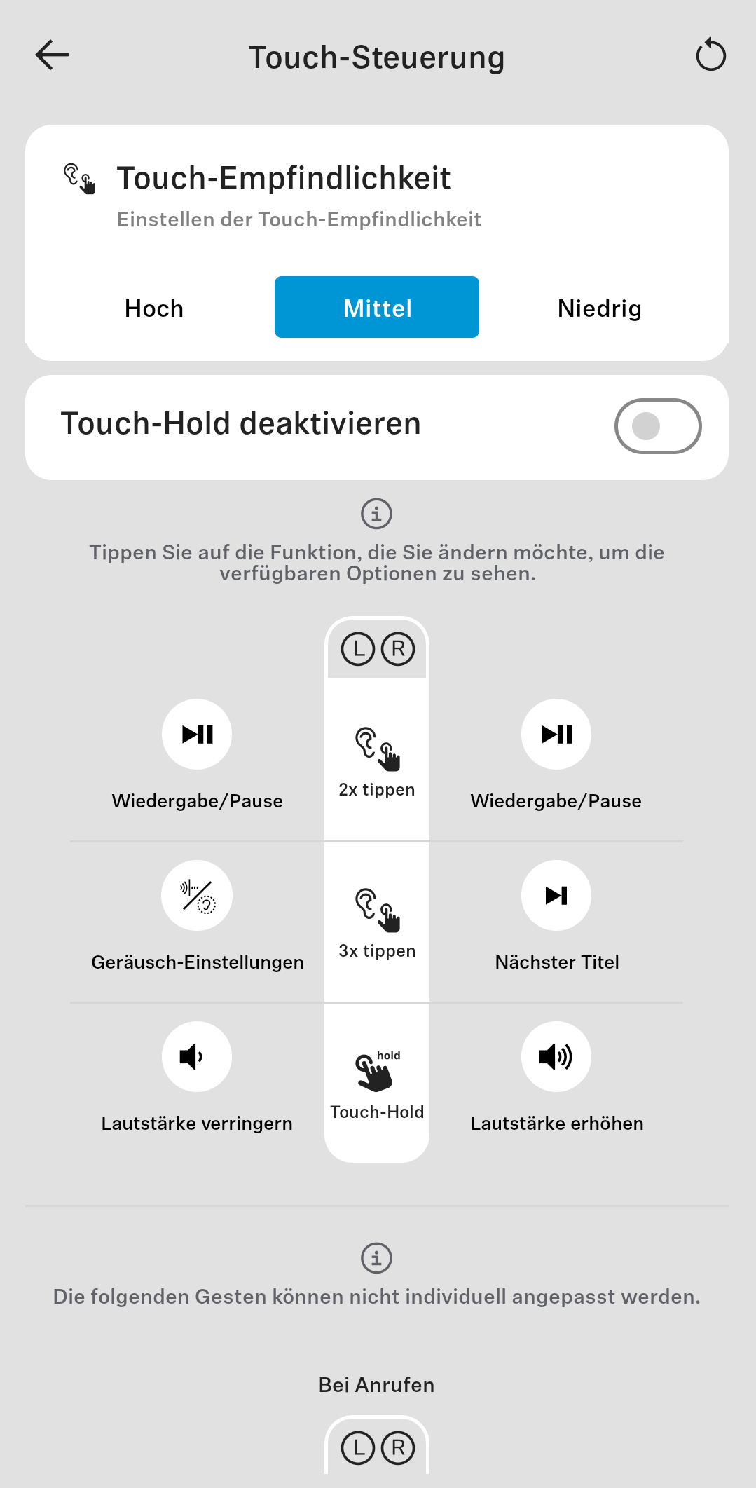 Die Personalisierung der Bedienelemente fällt Sennheiser-typisch sehr ausführlich aus. Du kannst beiden Earbuds einzelne Befehle für zwei, drei und lange Berührungen zuweisen. Einzelne Berührungen lösen keinen Befehl aus, Sennheiser scheint die hohe Empfindlichkeit dabei also im Blick gehabt zu haben.