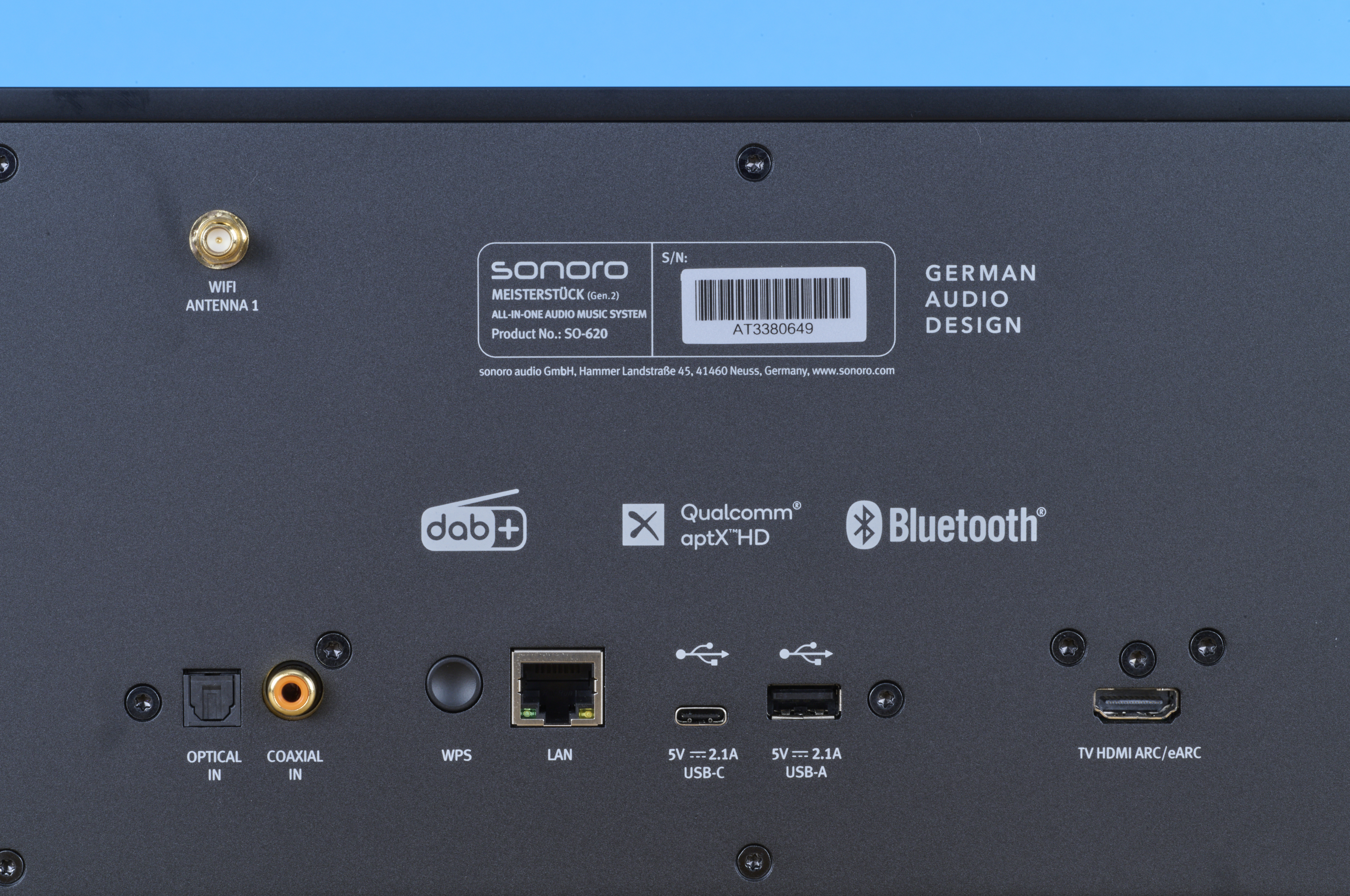 Wenn Krawall unerwünscht ist, kannst du am Meisterstück Gen. 2 auch jederzeit deinen Kopfhörer einstecken. Moderne Bluetooth-Hörer dürfen dank bidirektionalem Bluetooth ebenfalls direkt mit dem All-In-One Kontakt aufnehmen. Externe Zuspieler sind eigentlich unnötig, da das Sonoro über umfangreiche eigene Musikquellen verfügt. Aber du könntest ja noch über ein liebgewonnenes Tapedeck oder einen Plattenspieler verfügen. Da ergeben die beiden Line-Eingänge an der Rückwand dann doch wieder Sinn. Einen spezialisierten Phono-Eingang gibt es nicht. Dein Turntable sollte also einen eingebauten oder separaten Phono-Preamp mitbringen.