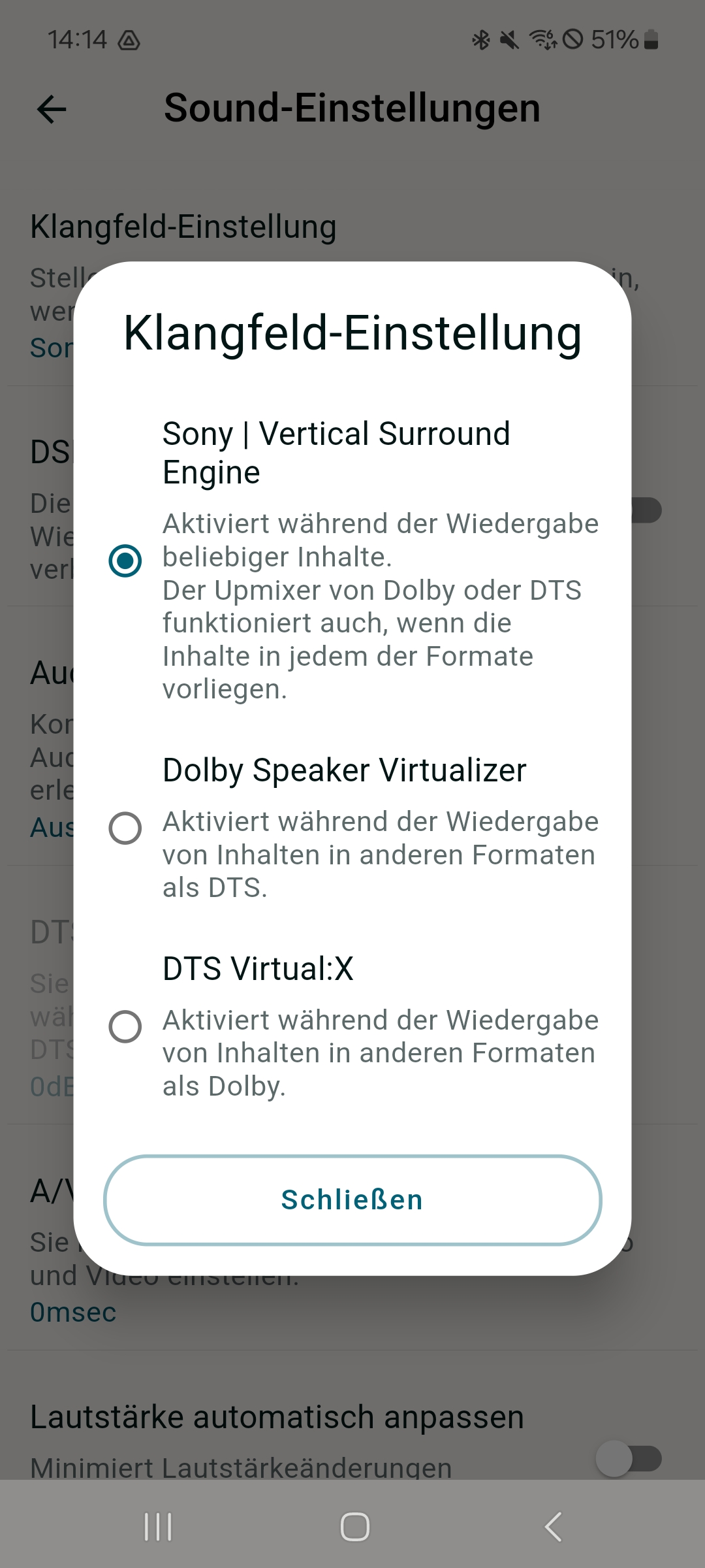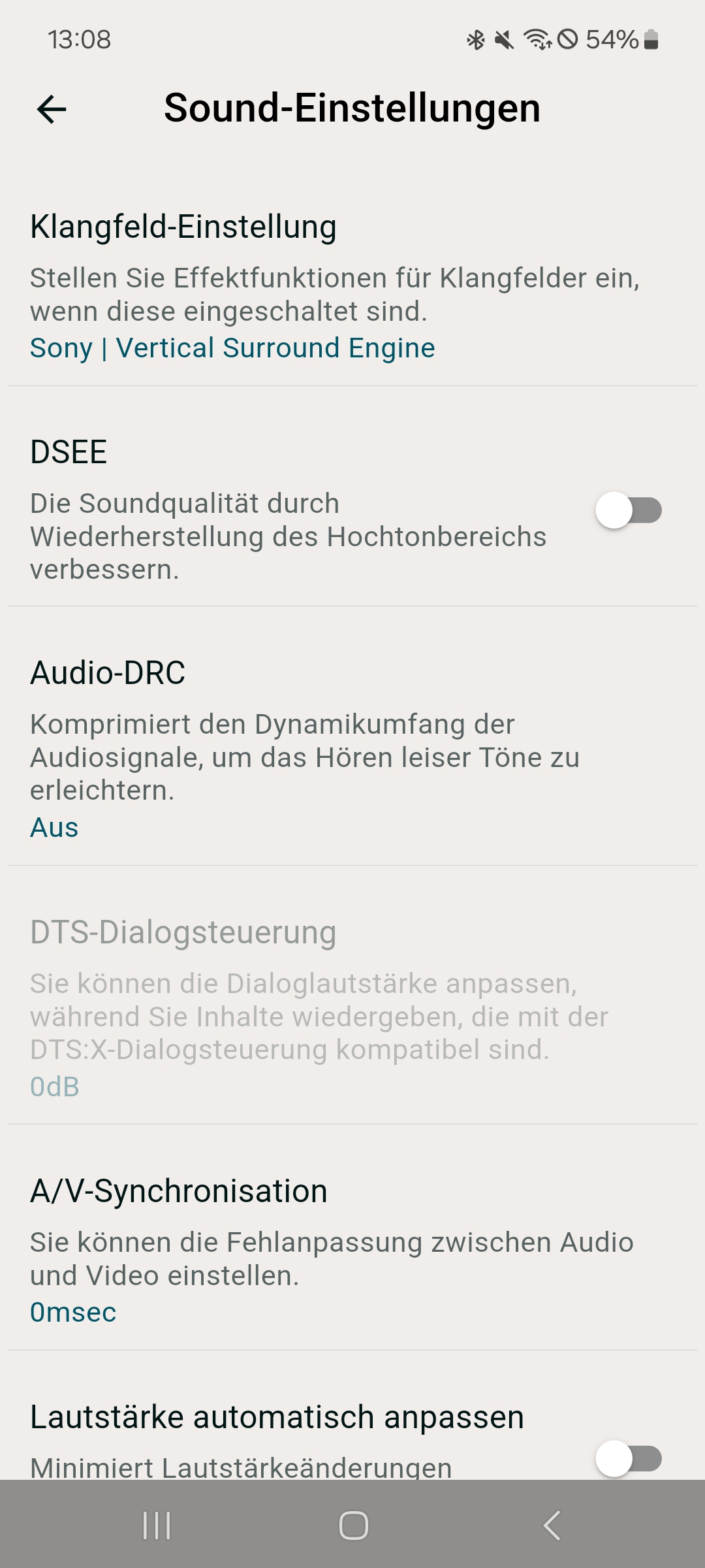 Na ja, und dann gibt es selbst bei den Klangeinstellungen kaum etwas zu berücksichtigen. Der einzige Klangmodus ist das Klangfeld, ansonsten kannst du noch ein wenig den Bass anpassen oder Sprach- sowie Nachtmodus hinzuschalten. Selbst bei der Klangfeld-Einstellung hat sich in unserem Test eigentlich immer die voreingestellte Vertical Surround Engine von Sony als gute Wahl entpuppt. Dabei handelt es sich um einen Upmixer, der den Klang deutlich erweitern soll.