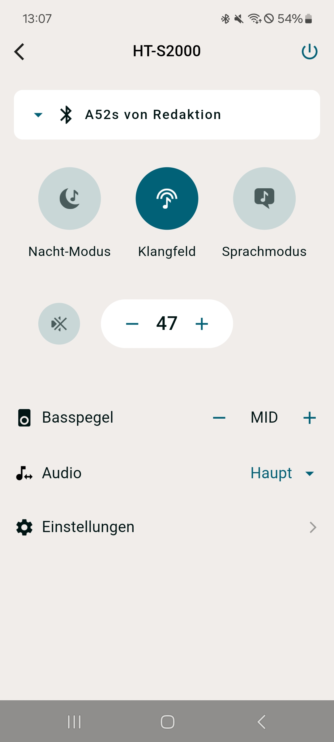 All diese Effekte schaffen es nur so weit, wenn wir den einzig verfügbaren Klangmodus Klangfeld einschalten. Ohne spielt sich sehr viel mehr direkt vor dem Fernseher ab, ohne weit um sich zu greifen. Allerdings kann das von Vorteil sein – etwa, wenn wir eine Nachrichtensendung sehen. Dann nämlich wirken insbesondere Stimmen mit aktiviertem Klangfeld etwas dünn. Deaktiviert ist das gesprochene Wort deutlich voluminöser – wenn auch ein wenig dumpfer und natürlich frontaler.