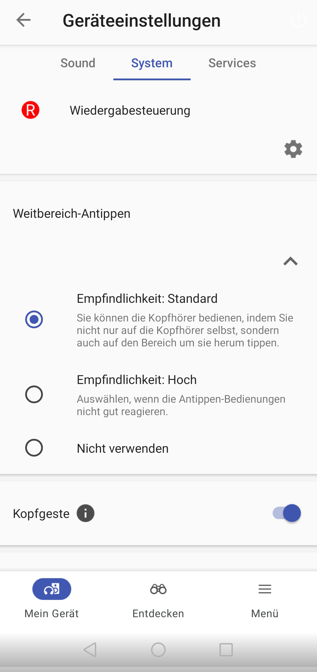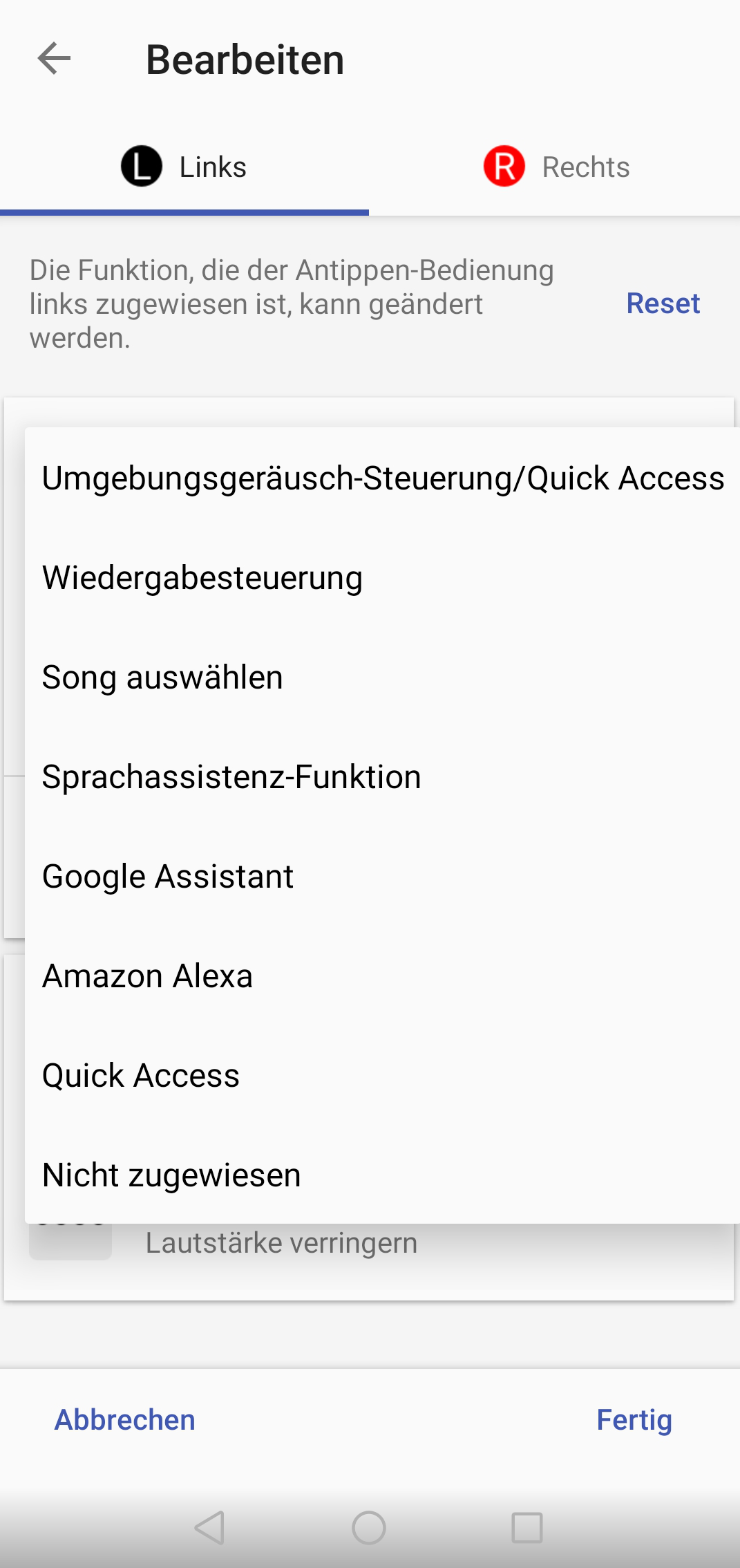 Leider hat Sony es versäumt, mit der neuen App auch mehr Personalisierbarkeit bei der Bedienung zu bieten. Wie zuvor kannst du hier nur zwischen diversen voreingestellten Bedienungsmustern wählen und die Befehle nicht frei zuweisen. So versteckt sich der Lautstärkeregler nach wie vor hinter vierfachem Tippen und ist so kaum intuitiver als ein Griff zum Smartphone selbst.