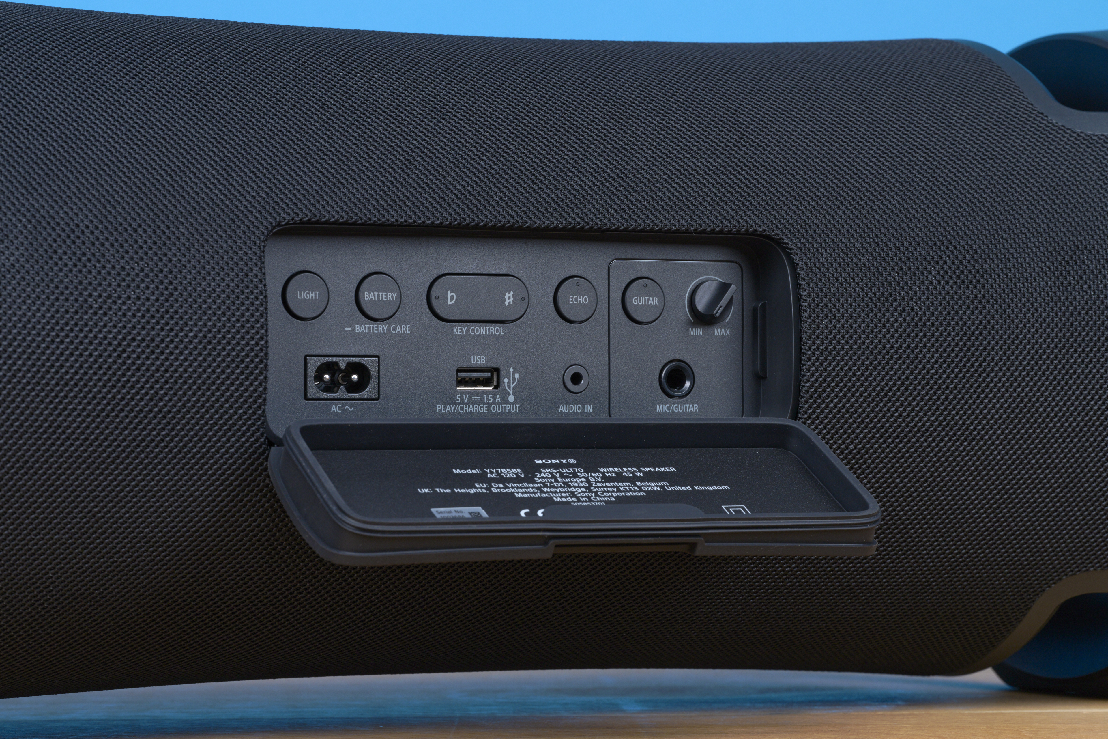 Neben einem 3,5-Millimeter-Klinkeneingang, über den du deinen Laptop oder einen MP3-Player anschließen kannst, findest du unter der Gummiabdeckung auf der Rückseite eine USB-A-Schnittstelle zum Laden deiner Geräte. Daneben gibt es aber eine Besonderheit: Eine 6,3-Millimeter-Klinke, mit der du deine Gitarre oder ein Mikrofon anschließen kannst. Für Karaoke-Partys gibt es sogar ein paar Extras: Über die „Key Control“ passt du den Song, der gerade spielt, an deine Stimmlage an. Mit „Mic Echo“ hallt deine Stimme. Für Musiker:innen ist das auf jeden Fall ein spannendes Feature. Für den noch professionelleren Einsatz fehlt leider ein XLR-Eingang.