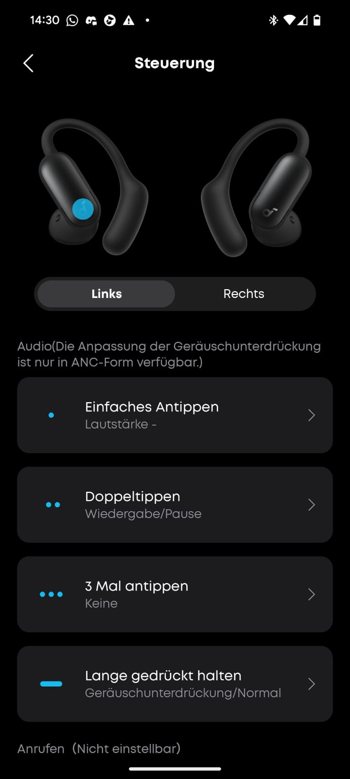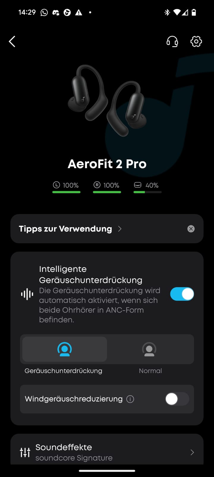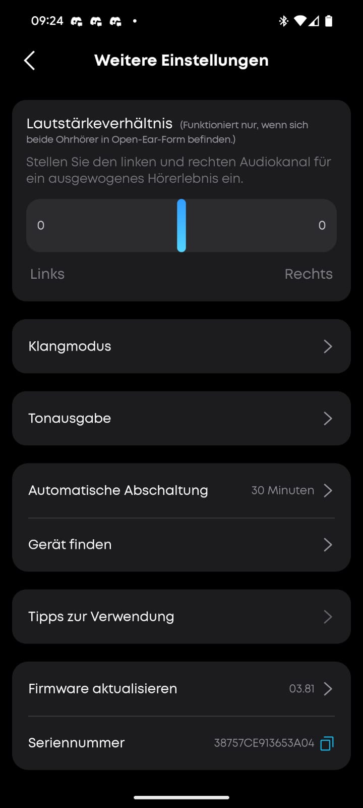 Auch das Lautstärkerverhältnis der beiden Earbuds lässt sich in der App justieren. Die Einstellungen gelten dann nur für den Open-Ear-Betrieb. Auch hier hat Soundcore also mitgedacht und die individuelle Form des Ohres, die bei allen Nutzer:innen für einen geringfügig unterschiedlichen Klangeindruck sorgt, berücksichtigt.