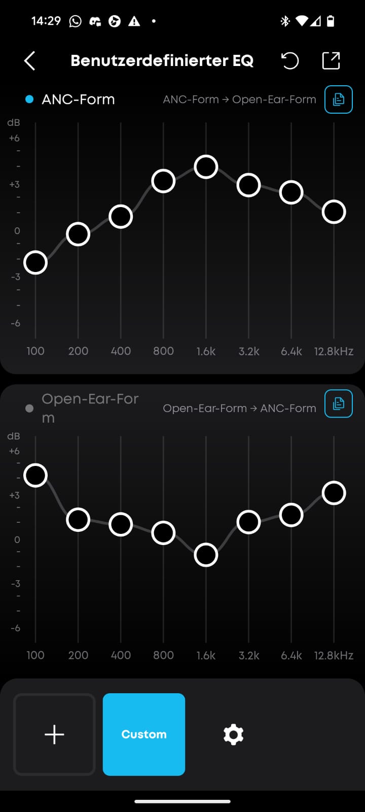 Im In-Ear-Modus stellen wir hingegen schnell fest, dass die AeroFit 2 Pro ab Werk eher auf den offenen Betrieb abgestimmt sind. Die Kopfhörer arbeiten jetzt in den Tiefen etwas zu bemüht, was zu ungewolltem Brummen, verdrängten Mitten und einem insgesamt eher ungenauen Klangbild führt. Das rückt natürlich den Equalizer in den Fokus, den wir uns hier ausnahmsweise mal vor dem Rest der App anschauen wollen.
