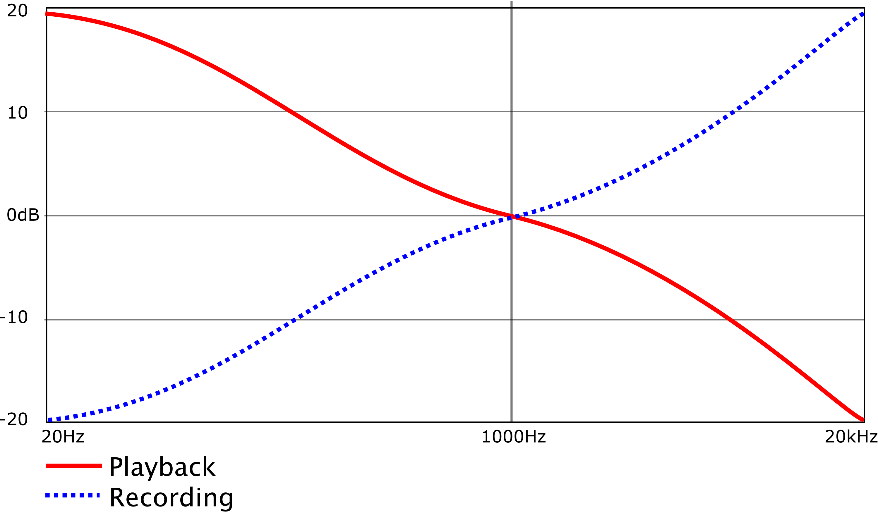 Die Aufnahme auf einer Schallplatte wird nach der RIAA-Kurve verzerrt (blau) und muss bei der Wiedergabe entsprechend entzerrt werden (rot) | Bild: Wikipedia Commons