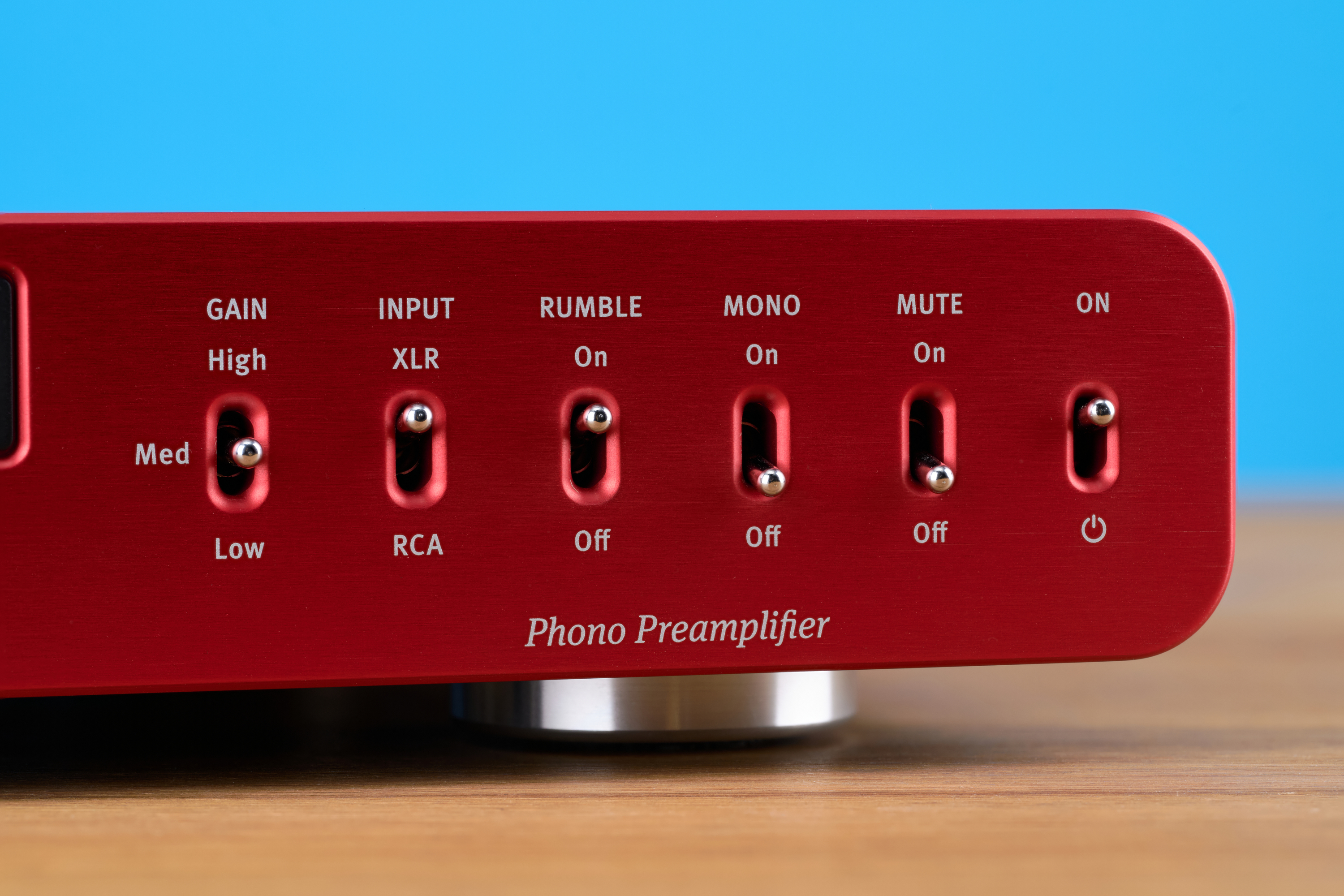 Auf dein konkretes System stellst du den Phonos mit einer Reihe von Kippschaltern und zwei knackigen Alu-Drehknöpfen ein. Für jede Systemart gibt es drei Verstärkungsstufen: MMs erhalten einen Gain von 30, 40 oder 50dB, je nachdem, ob der „Gain“-Schalter auf Low, Med oder High steht. Bei MC entsprechen diese Positionen 50, 60 und 70dB Verstärkung. Den passenden Abschlusswiderstand für dein MC stellst du am rechten der beiden Drehschalter ein. Sechs Werte zwischen 20 und 1000 Ohm stehen zur Wahl. Der linke Drehschalter bietet sechs Kapazitätswerte zwischen 12 und 330 Picofarad, die du brauchst, um MM-Systeme passend abzuschließen. Da der korrekte Wert vom Tonabnehmer, aber auch von den Phonokabeln abhängt, findest du die richtigen Einstellungen am besten nach Gehör.