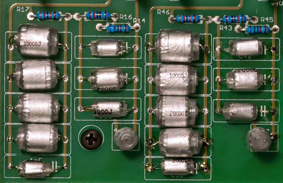 Die 120-V-Verstärkungsstufen im Phonos sind dagegen nahezu unmöglich zu übersteuern. Aufgebaut sind sie als Miniplatinchen aus diskreten, hochwertigen Einzelbauteilen: hochspannungsfeste Spezialtransistoren, toleranzarme MELF-SMD-Widerstände. Integrierte Bausteine gibt es für diese Aufgabe nicht: Typische Operationsverstärker-ICs erledigen zwar für einen Bruchteil des Preises einen ganz ähnlichen Job, lassen sich aber allenfalls mit ±15 Volt betreiben. Das reicht natürlich auch. Aber gerade bei Phono, mit dem großen Spektrum an möglichen Ausgangsspannungen, aber auch wegen der Knackser und subsonischen Störungen, die Headroom fressen, können die Reserven gar nicht groß genug sein.