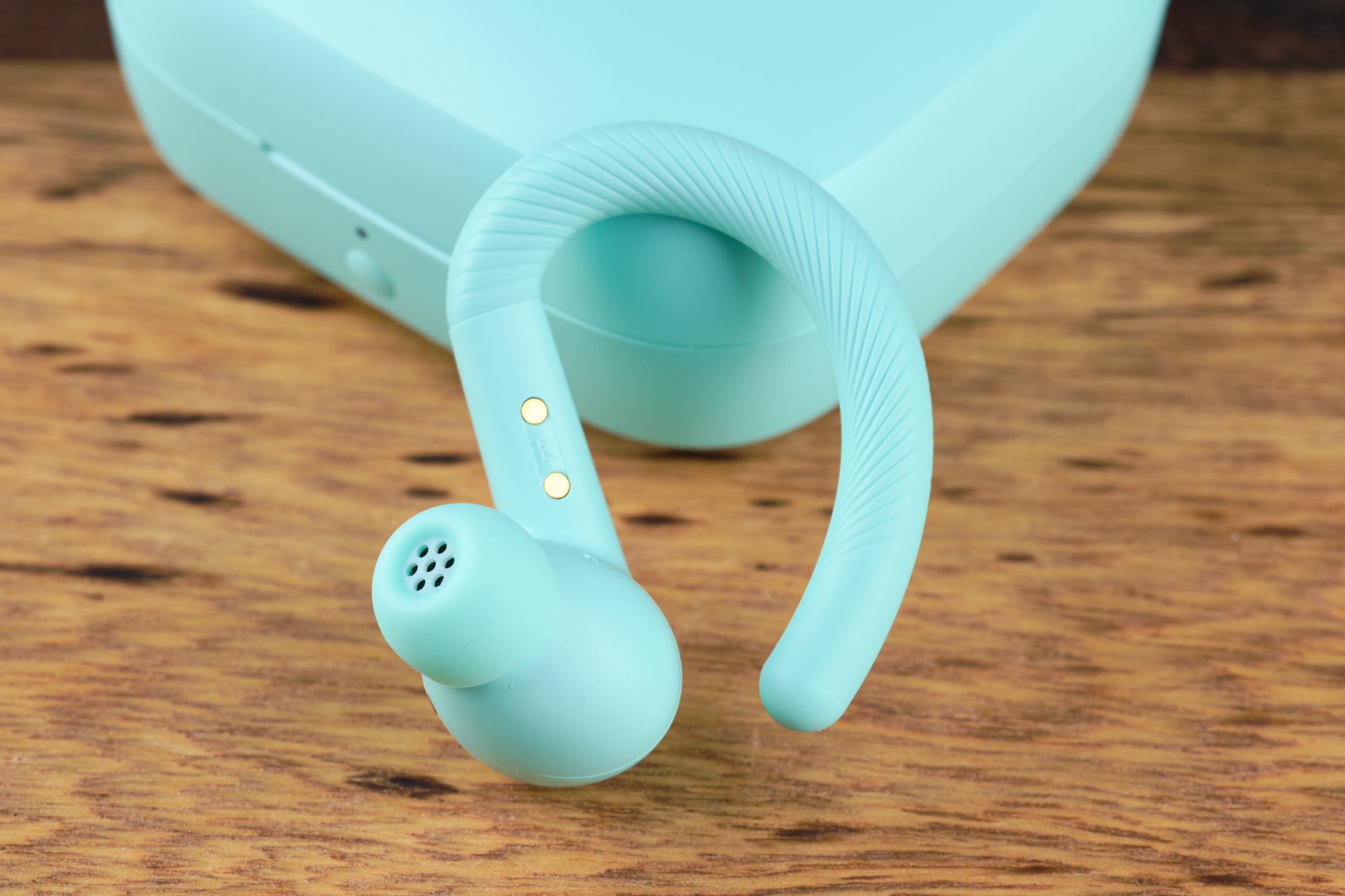 Beim Design setzt Teufel erneut auf Silikonaufsätze und Ohrbügel, um für besonders sicheren Halt zu sorgen. Auch hier ziehen wir die Powerbeats Pro 2 als vielleicht beliebteste Bügelkopfhörer zurate und vergleichen die Bauweise der beiden Modelle. Optisch ähneln sich Beats und Airy Sports TWS 2 stark, sobald wir aber Hand anlegen, drängt sich schon ein erster Unterschied auf. Die Teufel-Kopfhörer sind deutlich flexibler und nachgiebiger.