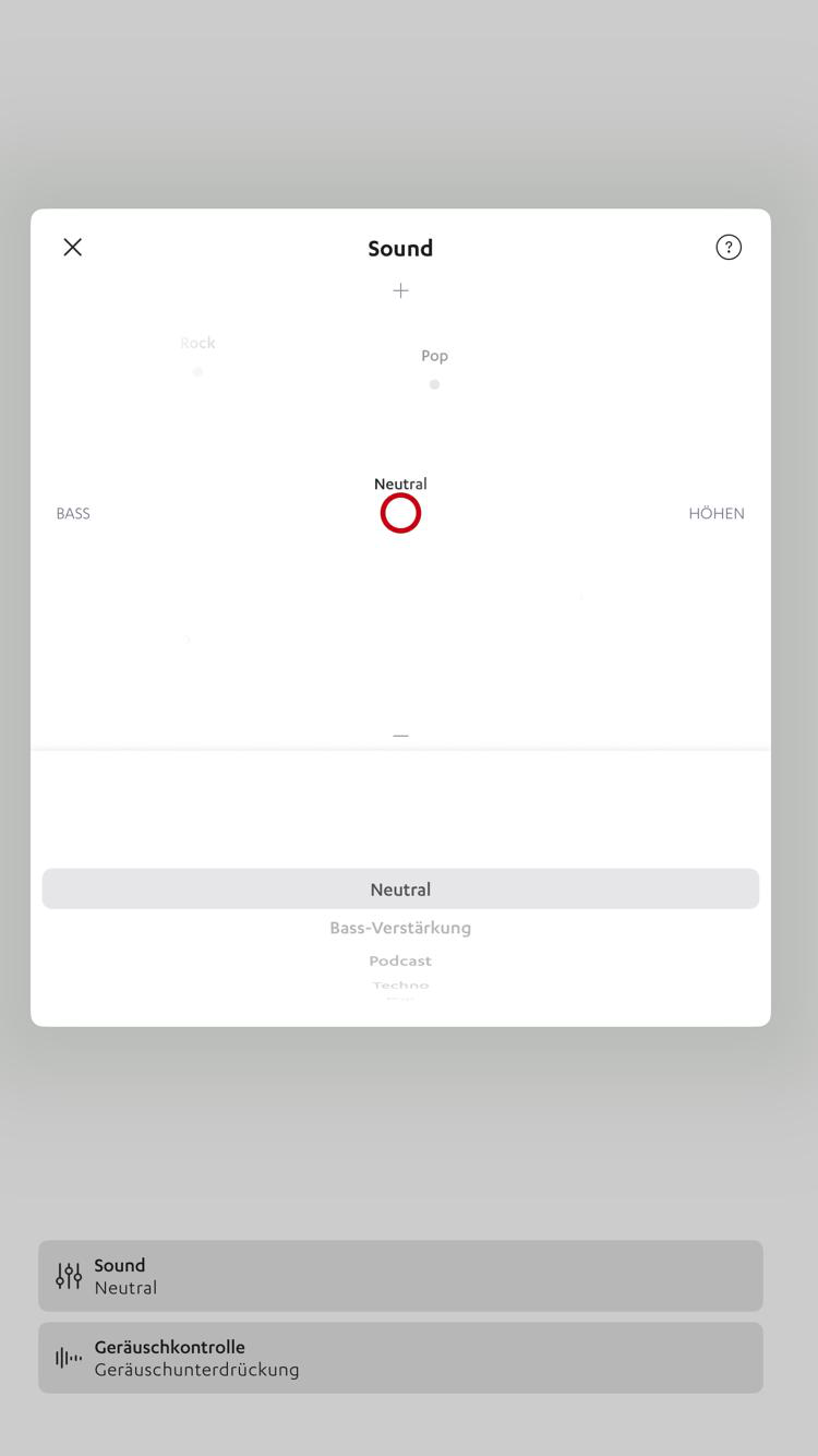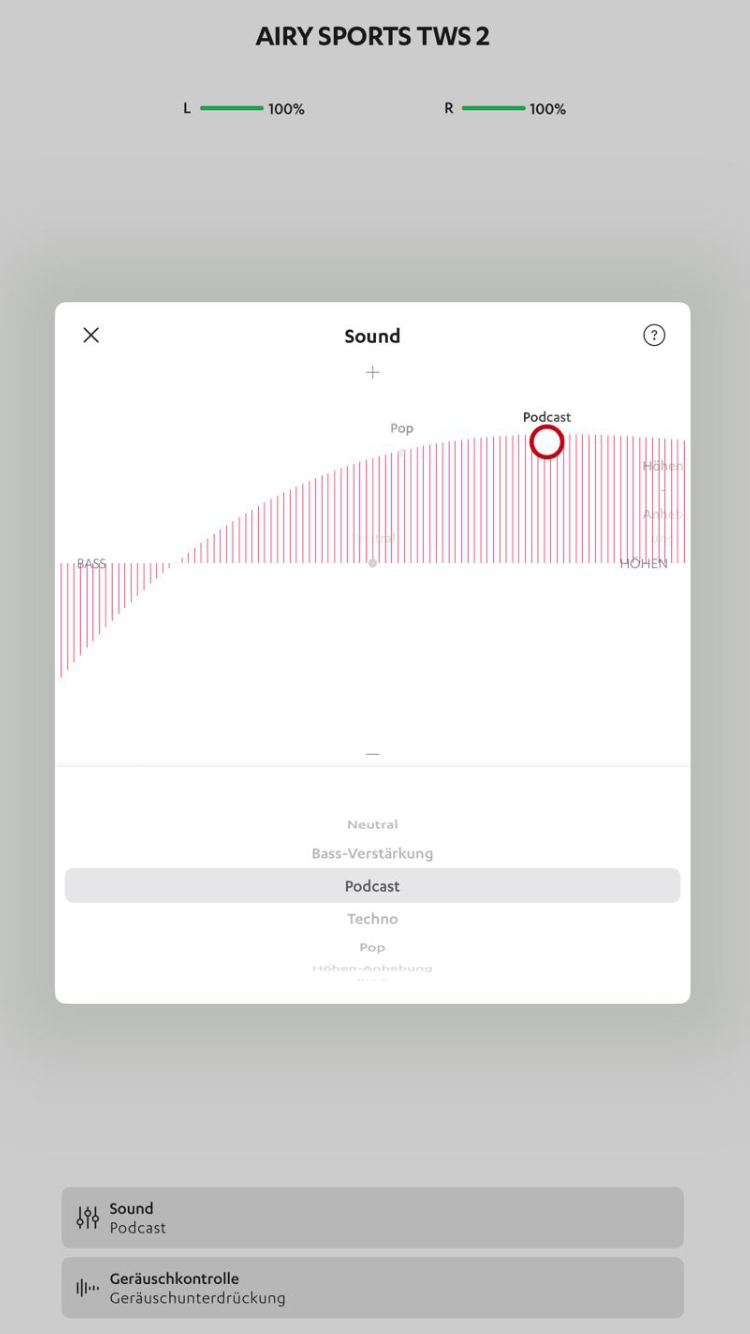 Alternativ kannst du die Presets auch einfach direkt anwählen und von da aus weiteres Feintuning vornehmen. Das gefällt im Test gut, bleibt aber auch die einzige wirkliche Personalisierung, die du in der App vornehmen kannst. ANC lässt sich hier zwar aktivieren und deaktivieren, nicht aber in seiner Intensität anpassen. Auch die Touch-Steuerung kannst du hier nur komplett ausschalten, aber keine Touch-Befehle neu und frei belegen. Wo wir schon bei der Bedienung der Teufel Airy Sports TWS 2 wären.