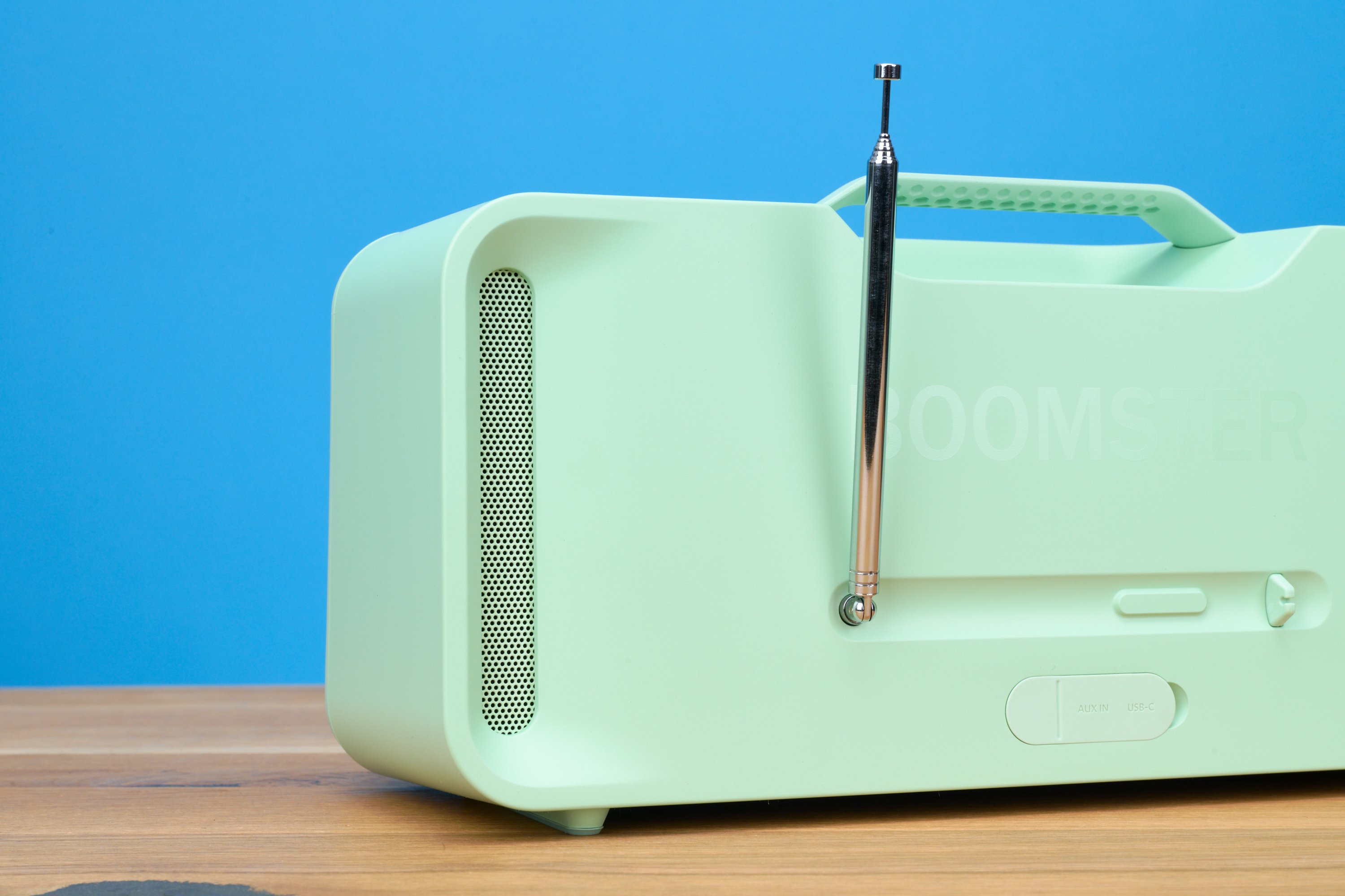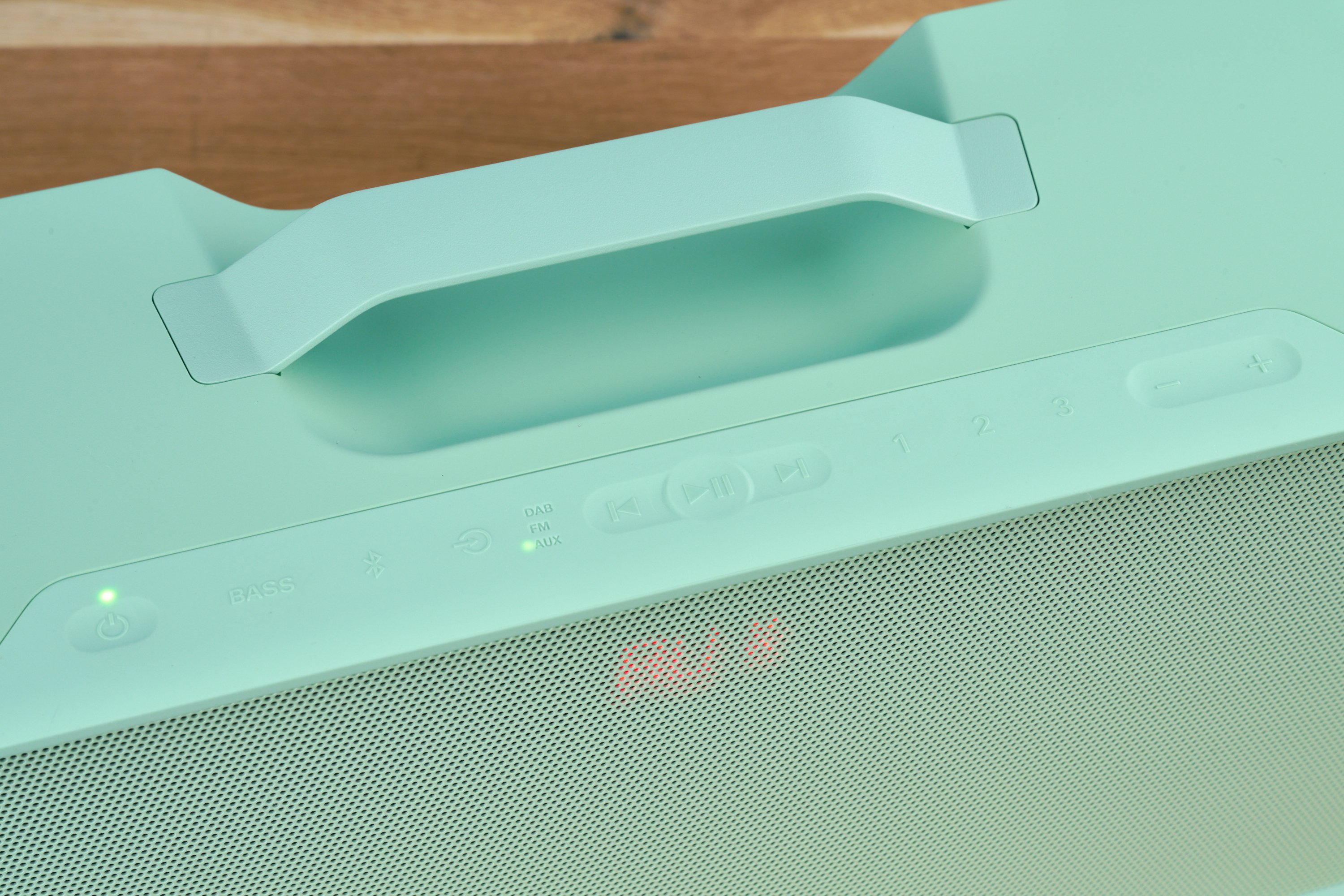 Anstelle einer App setzt der Boomster 4 auf zahlreiche Tasten zur Bedienung – und ein kleines Display. Über die Tasten kannst du die Wiedergabe steuern, die Lautstärke anpassen, zwischen unterschiedlichen Quellen (AUX, DAB, FM und Bluetooth) wählen und Radio-Presets einrichten und anwählen. Hier stehen dir sechs Preset-Slots für deine Lieblingssender zur Verfügung, die du über drei Tasten ansteuern kannst. Teilweise fällt der Druckpunkt hier etwas schmal und schwer aus.