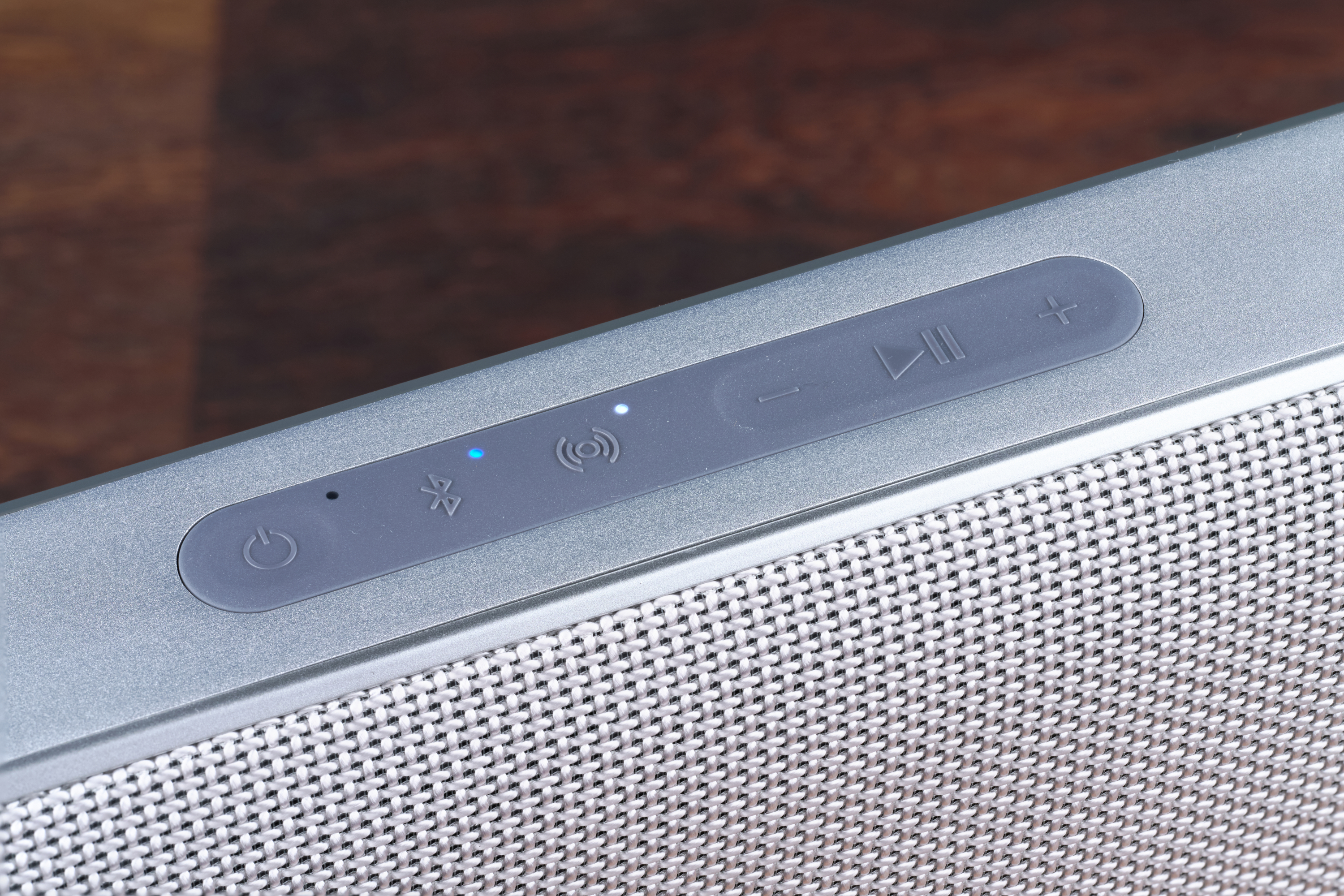 Zum Design müssen wir nicht viele Worte verlieren, viel hat sich nämlich nicht getan. Der Teufel Motiv Go 2 ähnelt seinem Ahnen von 2020 nämlich wie ein Ei dem anderen. Lediglich die Bedienleiste wurde einer Frischzellenkur unterzogen und komplett auf die Oberseite verfrachtet. Zuvor musstest du zur Bluetooth-Kopplung noch seitlich am Motiv Go hantieren, jetzt läuft die Bedienung gebündelt über eine Leiste.