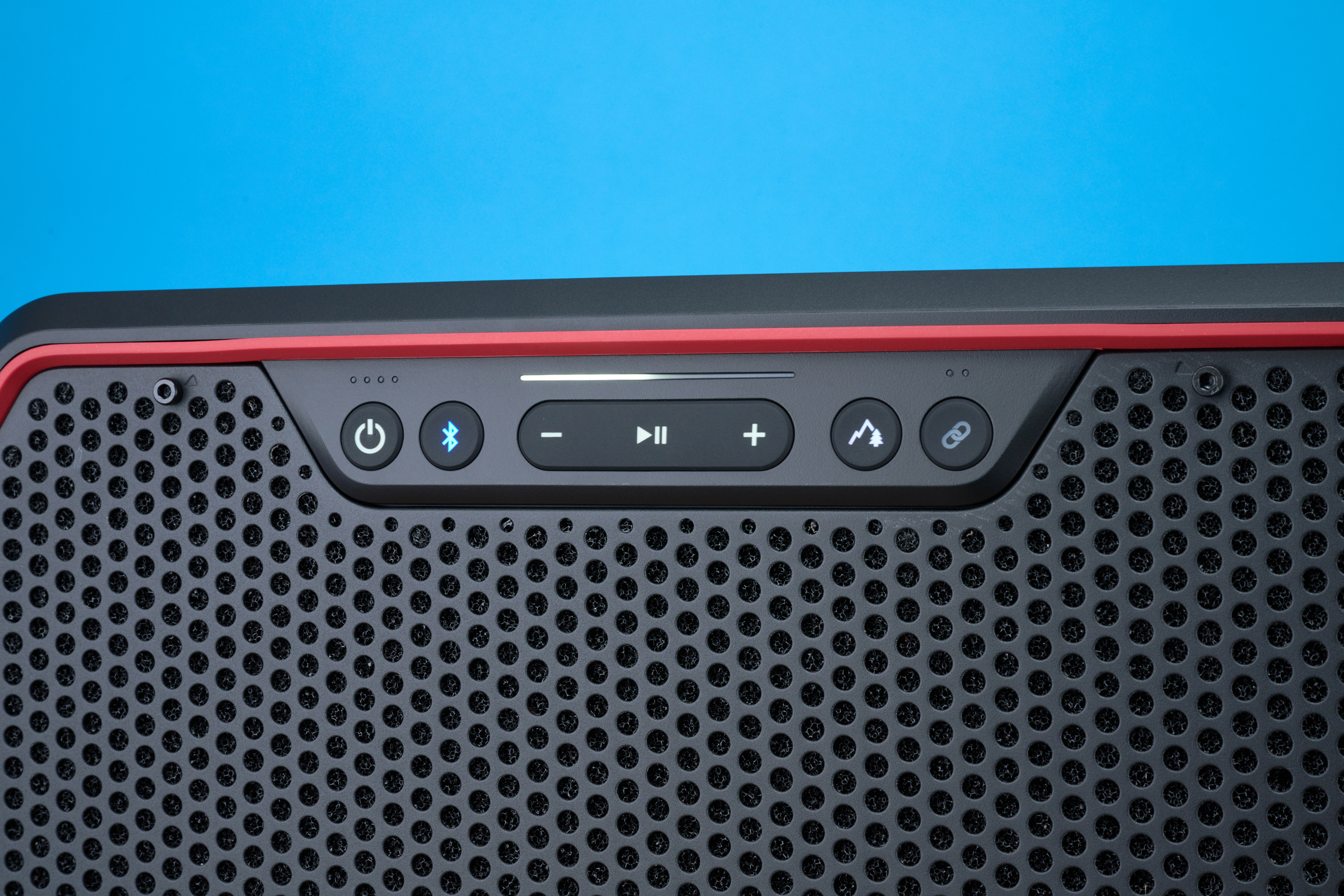 Ein Knopf zeigt eine Bergspitze: Dahinter verbirgt sich der Outdoor-Modus. Er soll vor allem die Mitten und Höhen hervorheben, um den Klang in lauten Umgebungen verständlicher zu machen. Im Test fanden wir allerdings, dass er den Sound nur minimal verändert. Drückst du den Knopf länger, wechselt der Lautsprecher in einen Eco-Modus, bei dem die maximale Lautstärke und der wiedergegebene Frequenzbereich begrenzt werden, um Akkulaufzeit zu sparen.