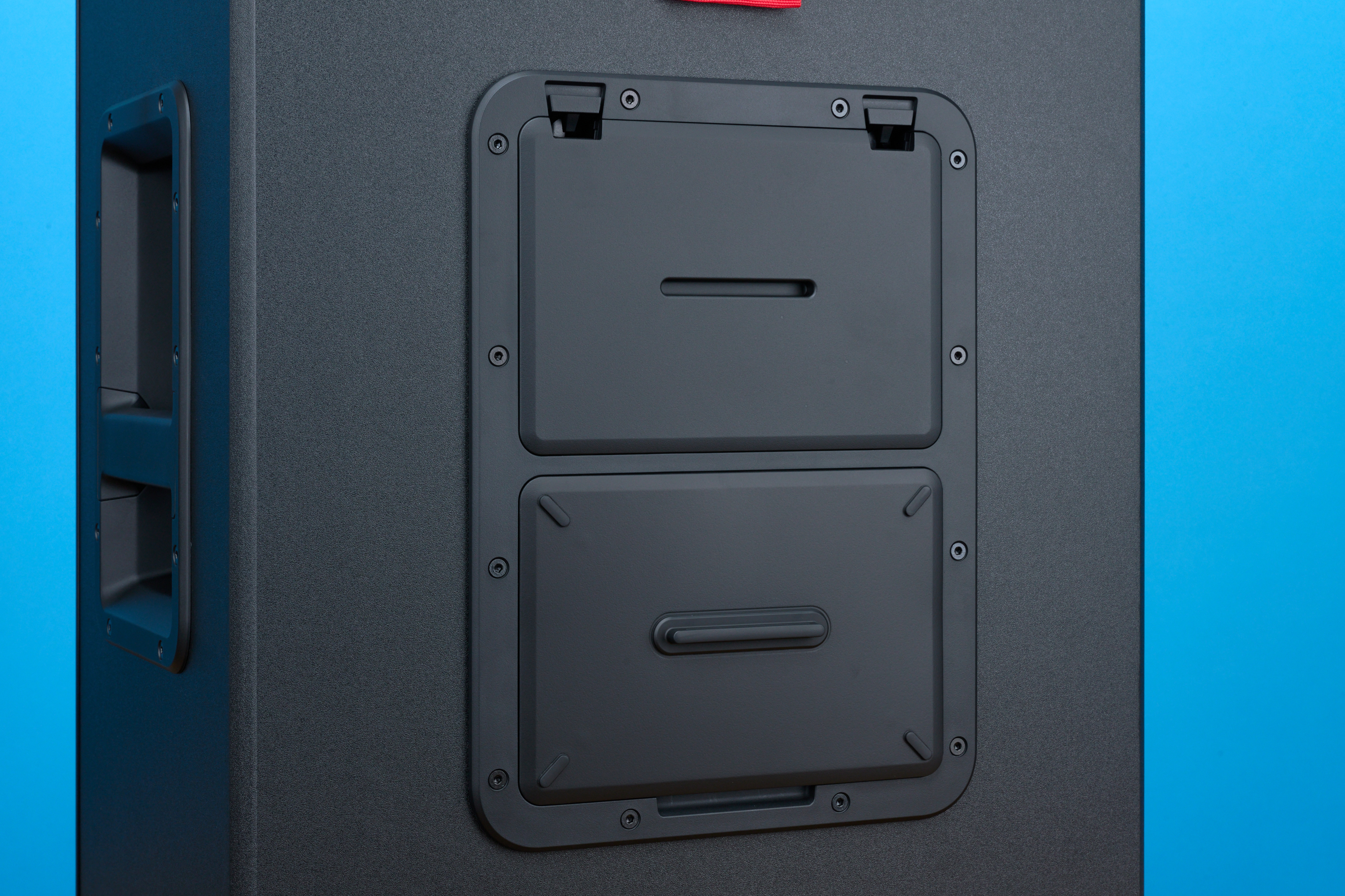 Anders als der große Rockster ist der Neo nicht auf Rollen aufgebockt. Stattdessen transportierst du ihn mittels zweier Tragegriffe, die seitlich in die Box eingelassen sind. Optisch steht er ganz in Linie mit dem Teufel-Portfolio: kantiges, schwarzes Gehäuse mit roten Akzenten. Besonders auffällig: das große Teufel-„T“ auf der Front.