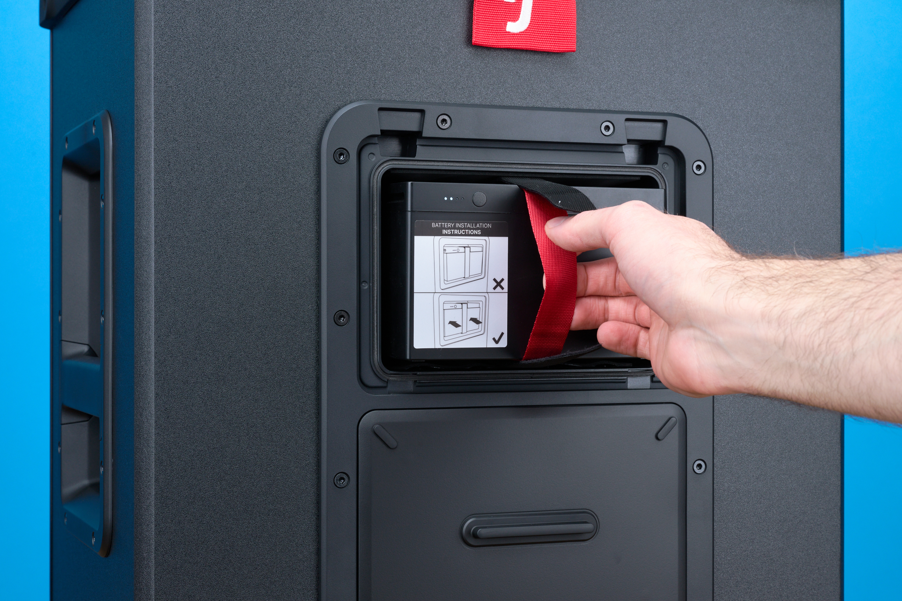 Der Akku der Teufel-Partybox sitzt auf der Rückseite hinter einer kleinen Klappe. An der Batterie selbst findest du, wie an der Oberseite des Lautsprechers, eine Akkuanzeige. Zeigt sie an, dass der Akku leer ist, kannst du ihn einfach entfernen und, falls du einen zweiten Akku besitzt, auswechseln. Aber Achtung: Die Akkus sind nicht außerhalb der Box ladbar, wie bei der Soundboks 4. Du kannst sie nur aufladen, während sie in der Box stecken. Möchtest du mehrere Akkus zur Party mitnehmen, musst du sie also vorher alle einzeln in die Box stecken und am Stromkabel laden.
