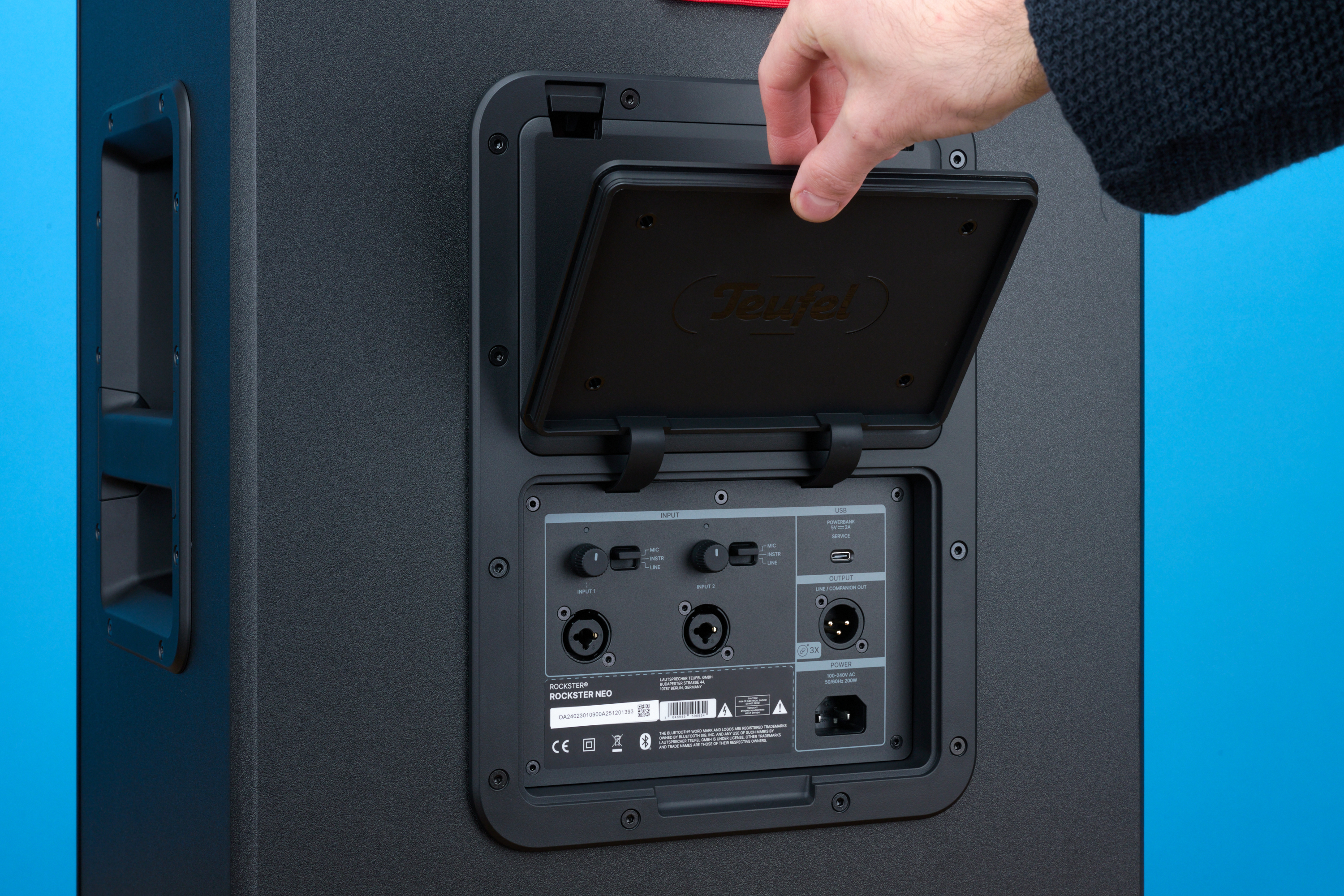 Unter dem Akku sitzt eine weitere Klappe. Sie ist mit flexiblen Scharnieren am Gehäuse befestigt und lässt sich in eine Einbuchtung in der Akku-Klappe stecken, um nicht im Weg zu sein. Unter ihr liegen die Anschlüsse des Rockster Neo. Da wäre zunächst ein XLR-Ausgang, über den du andere Boxen verbinden kannst. Bis zu zehn Rockster Neo, Rockster oder Rockster Air 2 können so im Mono-Betrieb spielen. Kabellos kannst du sogar bis zu 100 Lautsprecher miteinander verbinden und synchron spielen lassen. Allerdings sind hier nur die vergleichsweise kleinen Bluetooth-Lautsprecher Teufel Mynd und Rockster Go 2 kompatibel. Für Stereo-Musik benötigst du zwei Rockster Neo, die entweder per Kabel oder kabellos miteinander verbunden werden.