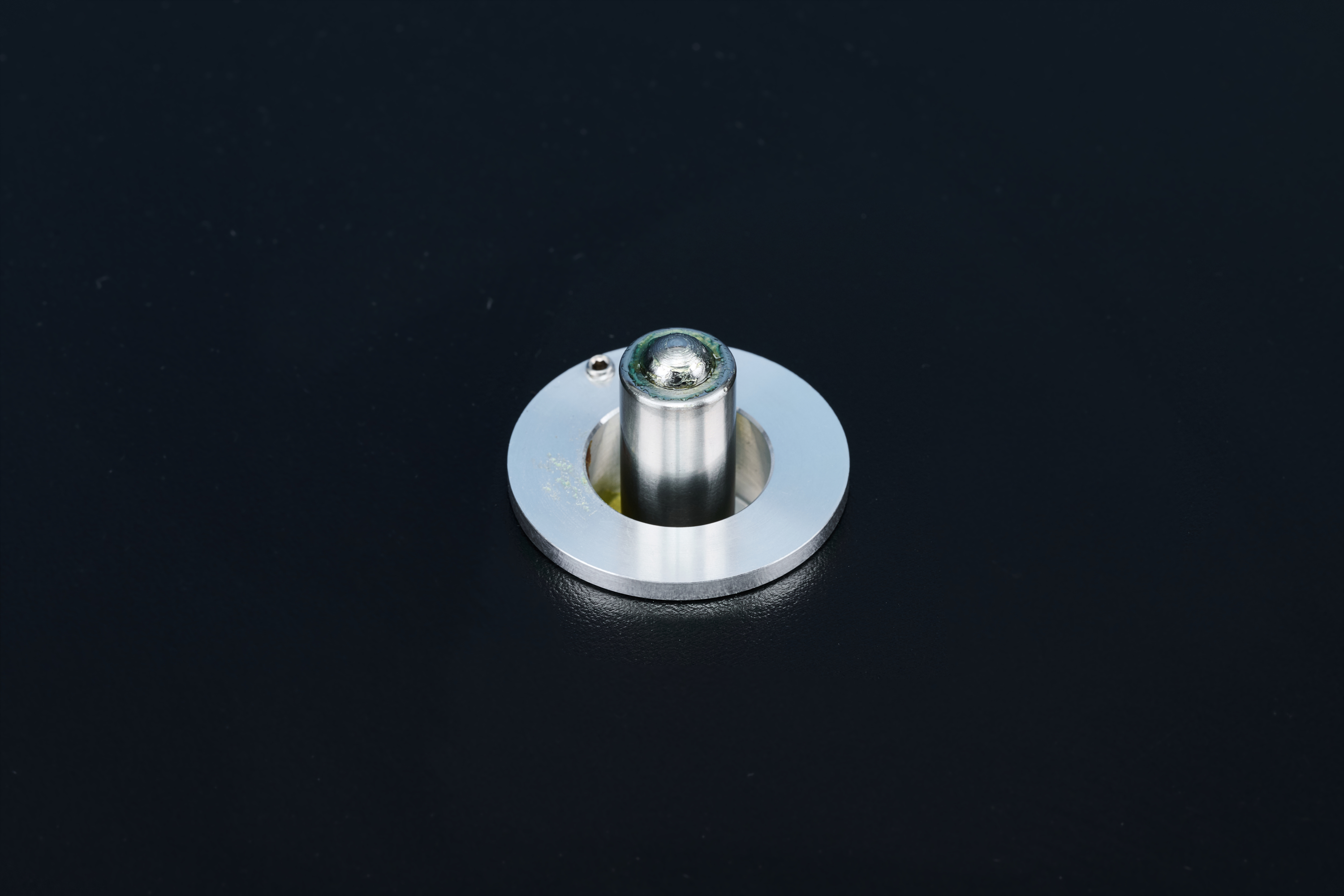 Simpel und wuchtig wie das Antriebsaggregat ist auch das Tellerlager mit seiner 13 Millimeter dicken Stahlachse. Die Achse ist mit einer mächtigen Sechskantmutter an dem massiven MDF-Chassis des Player fixiert und ragt von diesem aus nach oben. Der Teller trägt das Gegenstück in Form einer eingepressten Messingbuchse, als Schmiermittel dient Fett. Dieses Lager lief im Hörtest extrem leise und weich – und dürfte auch bei Dauerbetrieb bis ans Ende aller Tage rotieren.