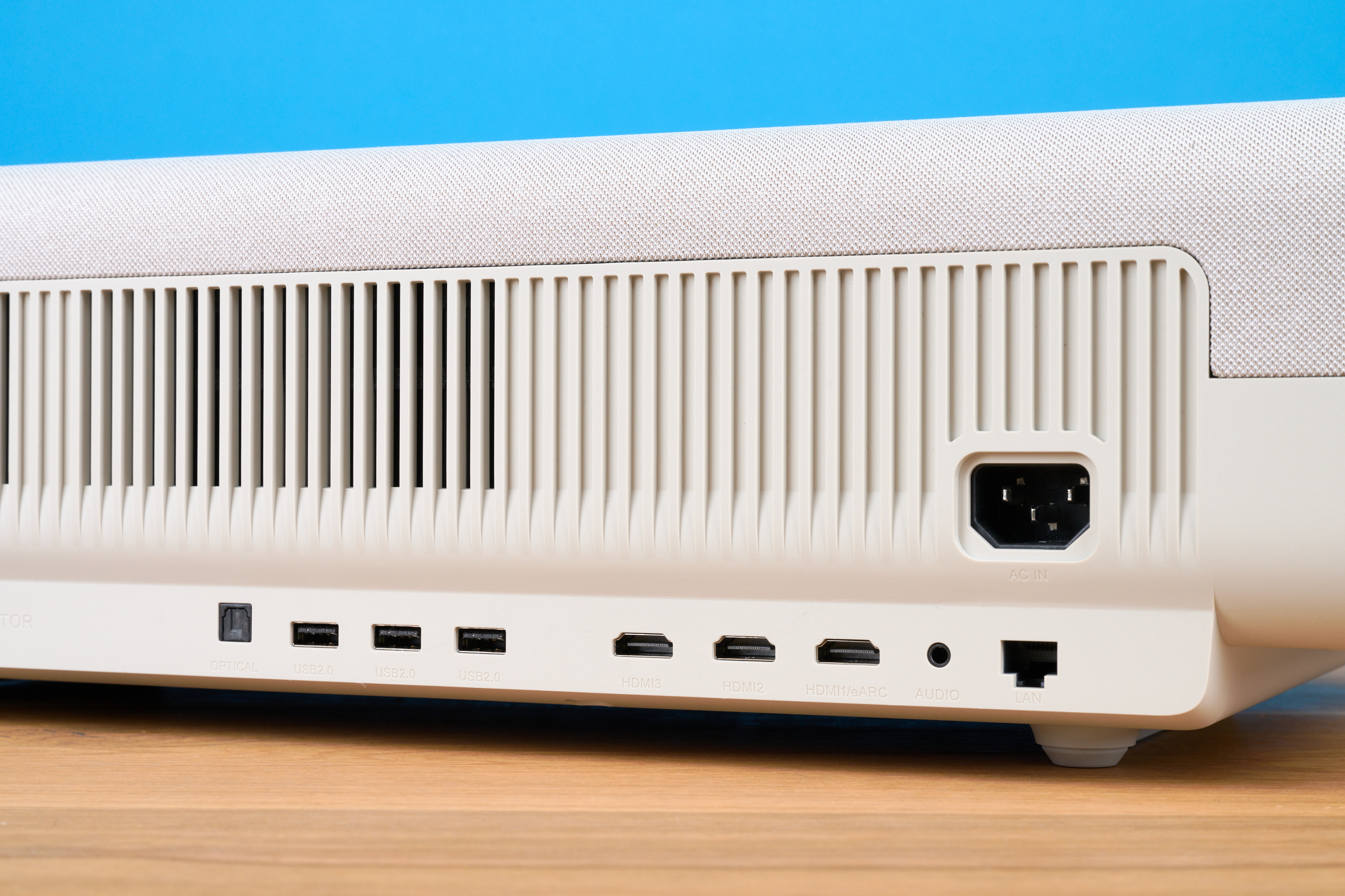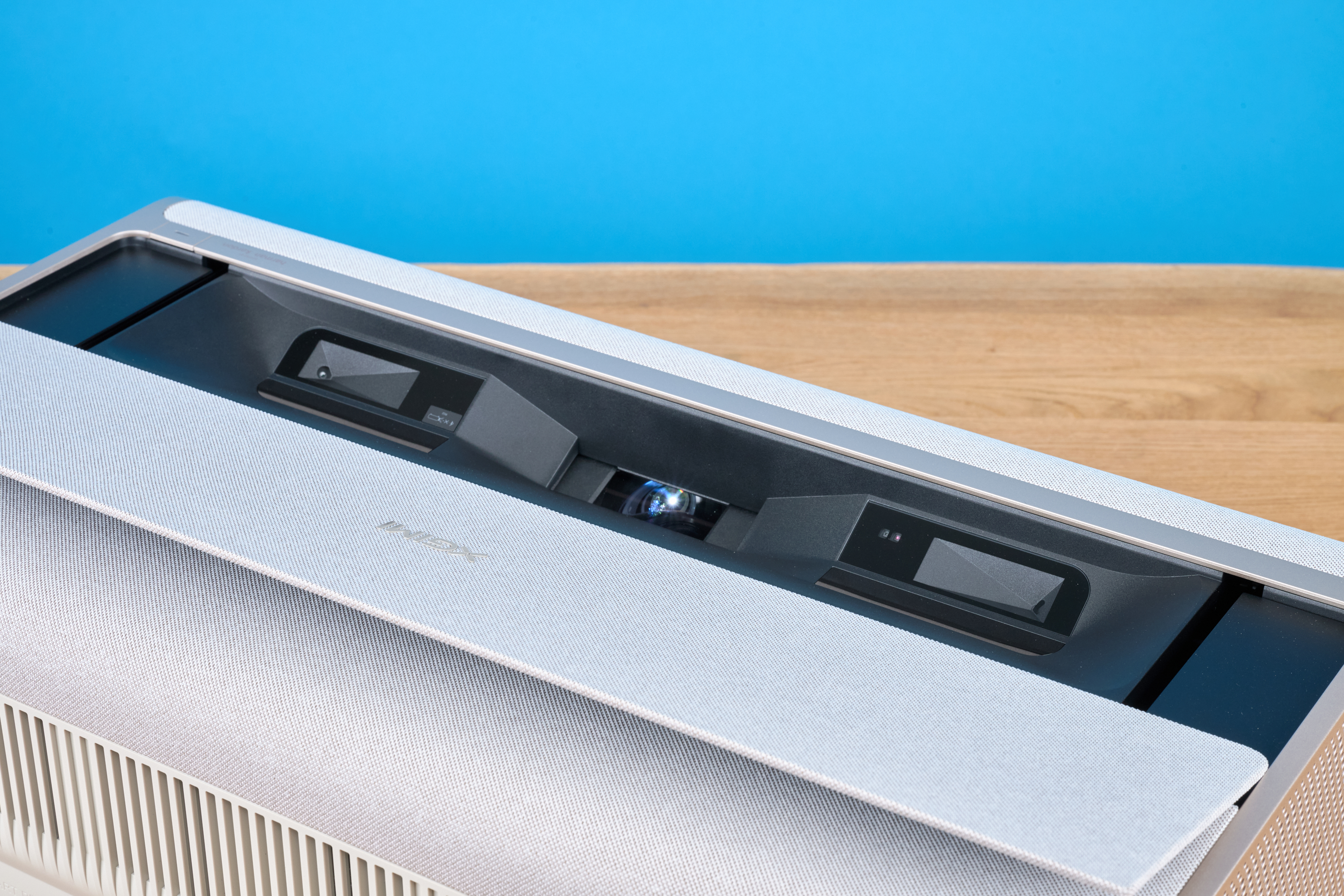 Dank der Aluminium-Akzente wirkt der Aura 2 zudem hochwertiger als andere bisher von uns getestete Ultrakurzdistanz-Beamern. Mit einer Tiefe von rund 37 Zentimetern passt der Aura 2 bequem auf ein Sideboard. Für ein 100-Zoll-Bild muss er dann etwa 17-18 Zentimeter von der Wand stehen. Dank extrem kurzem Projektionsverhältnis von 0,177:1 kann er bereits aus geringer Distanz riesige Bilder bis 150 Zoll Diagonale an die Leinwand werfen – bisherige Spitze in diesem Testfeld.