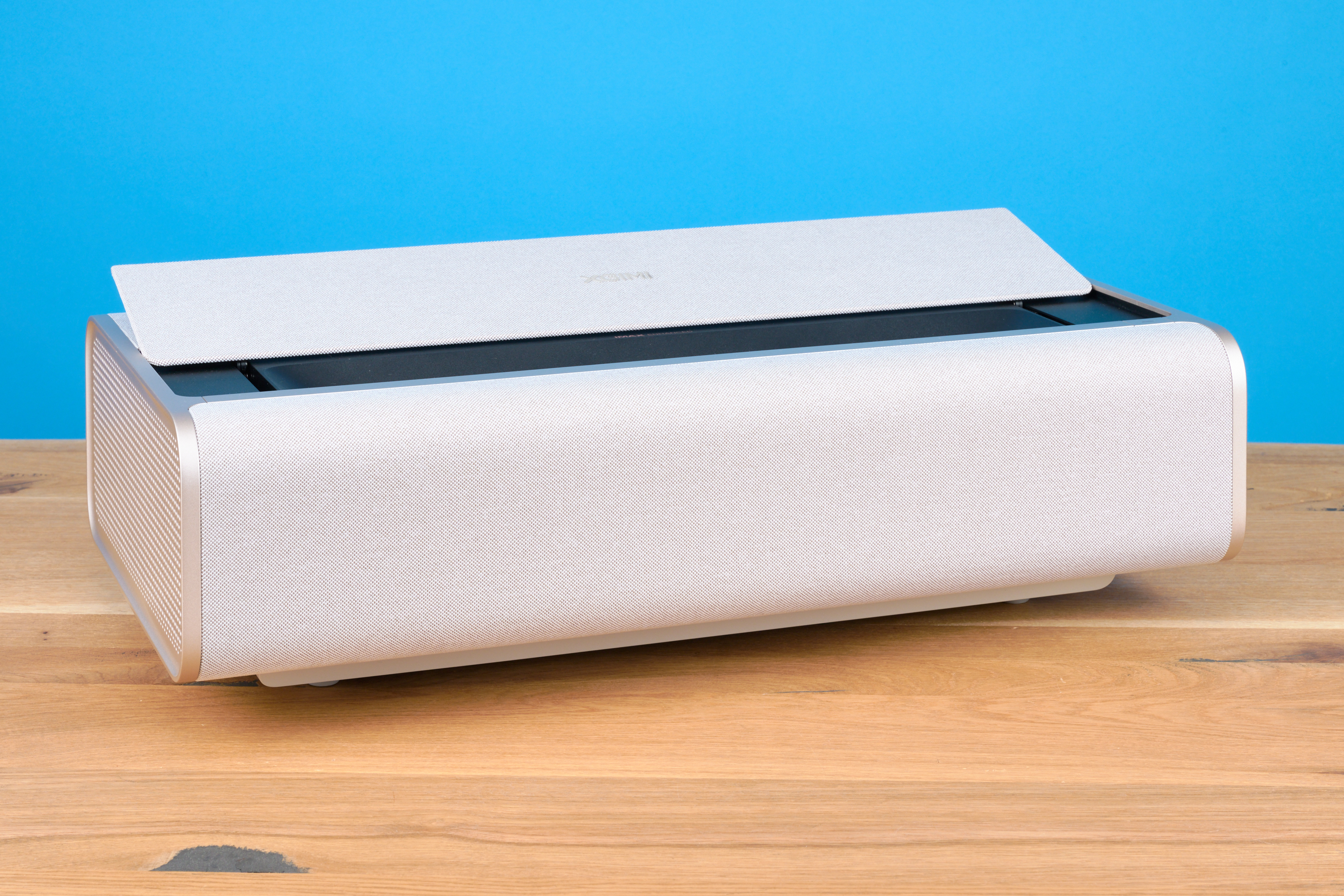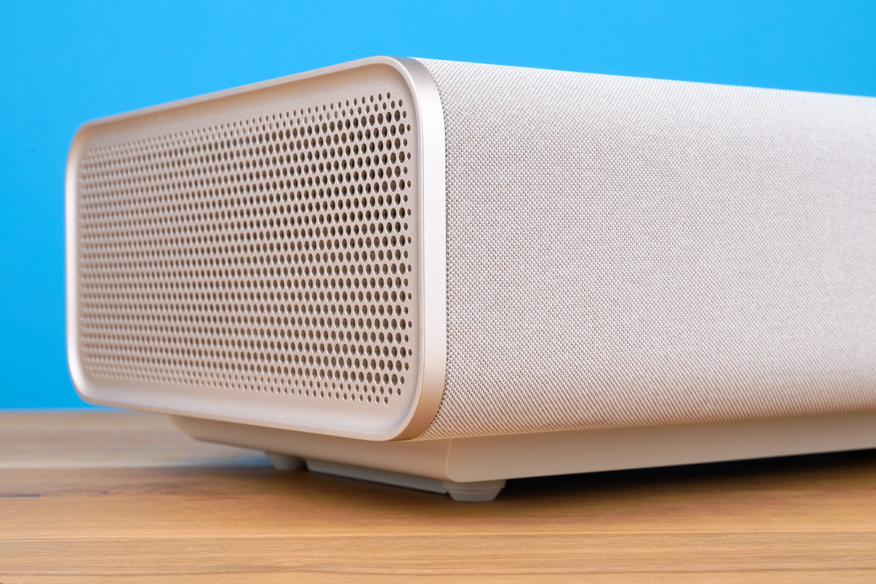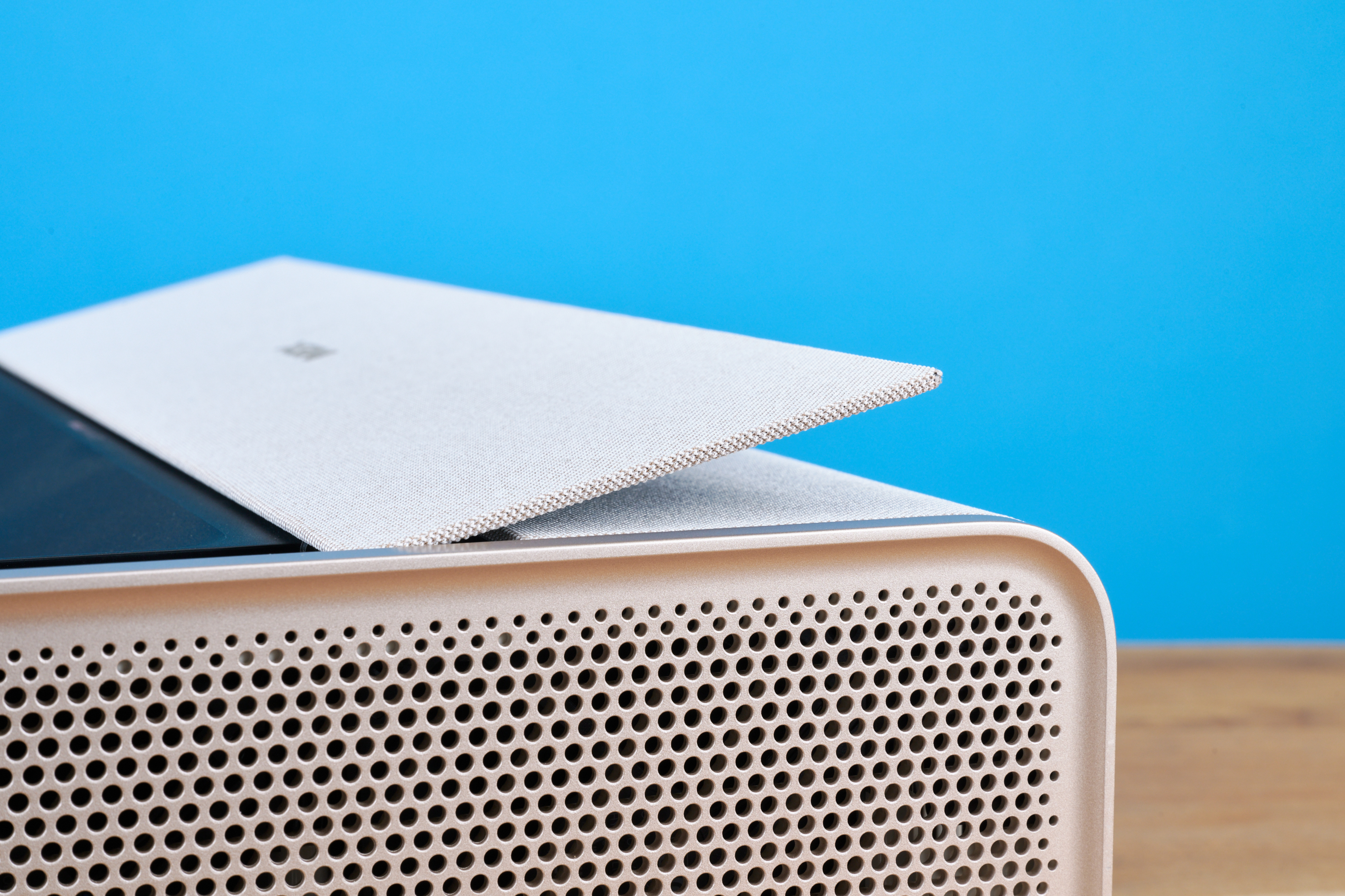 Der Xgimi Aura 2 gehört zu den Geräten, bei denen man sich fragt: wieso nicht immer so? Aufgestellt ist er in wenigen Minuten – auspacken, Strom anschließen, einschalten. Zumal er sich optisch von der oft schlicht schwarzen oder weißen Konkurrenz abhebt. Sein Gehäuse ist in Beige mit Stoffbezug gehalten und wirkt elegant und unauffällig fürs Wohnzimmer.