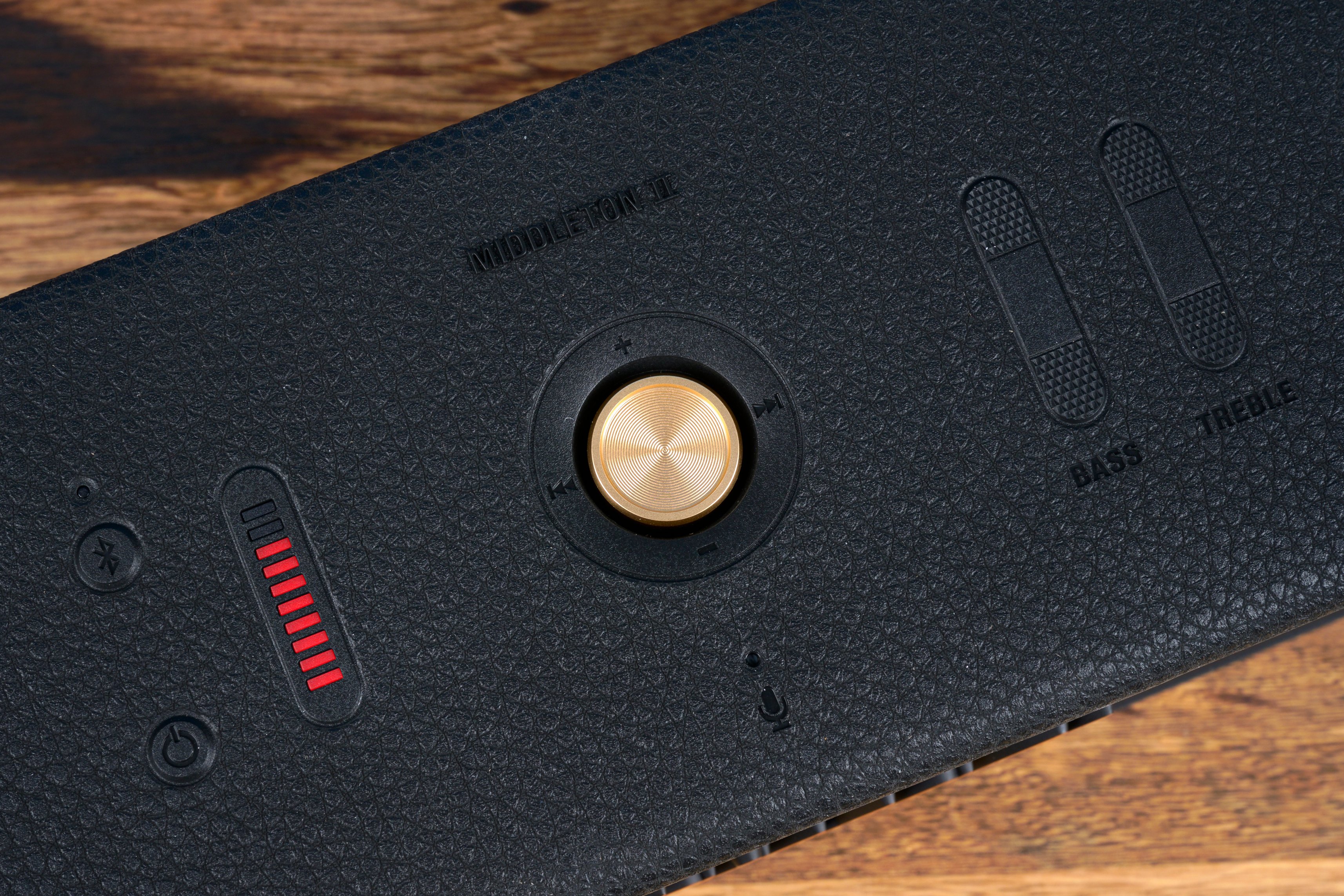 Marshall bietet dieselben grundsätzlichen Regler, legt aber noch jeweils einen EQ- und Treble-Regler obendrauf. Das gefällt gut, weil du so schon ohne App Feinjustierungen am Sound vornehmen kannst. Auf einen Shortcut-Knopf, wie ihn etwa der teurere Marshall Kilburn III bietet, verzichtet Marshall hier.
